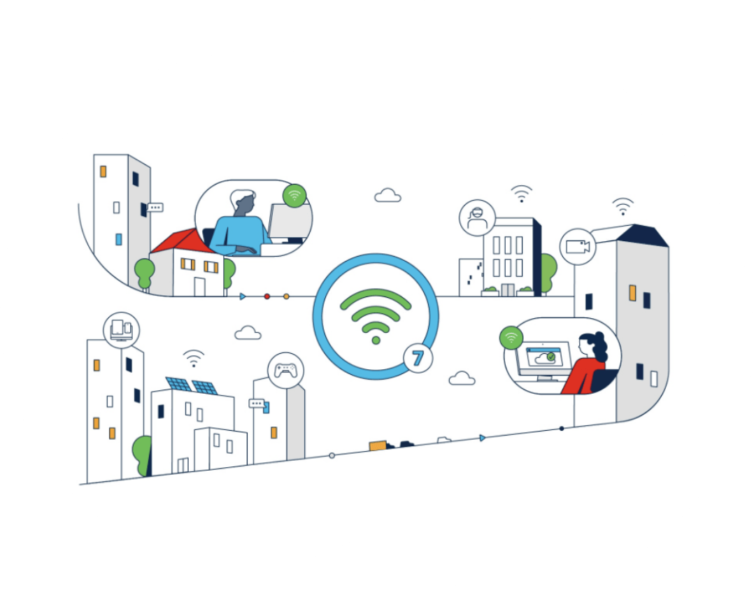 Wi-Fi 7は、超高速・超低遅延・高密度環境対応を特徴とする、次世代無線通信規格。6GHz帯を活用し、最大46Gbps超の通信速度やMulti-Link Operation(MLO)による通信の安定性など、働き方や業務環境の進化に不可欠なインフラを実現します。