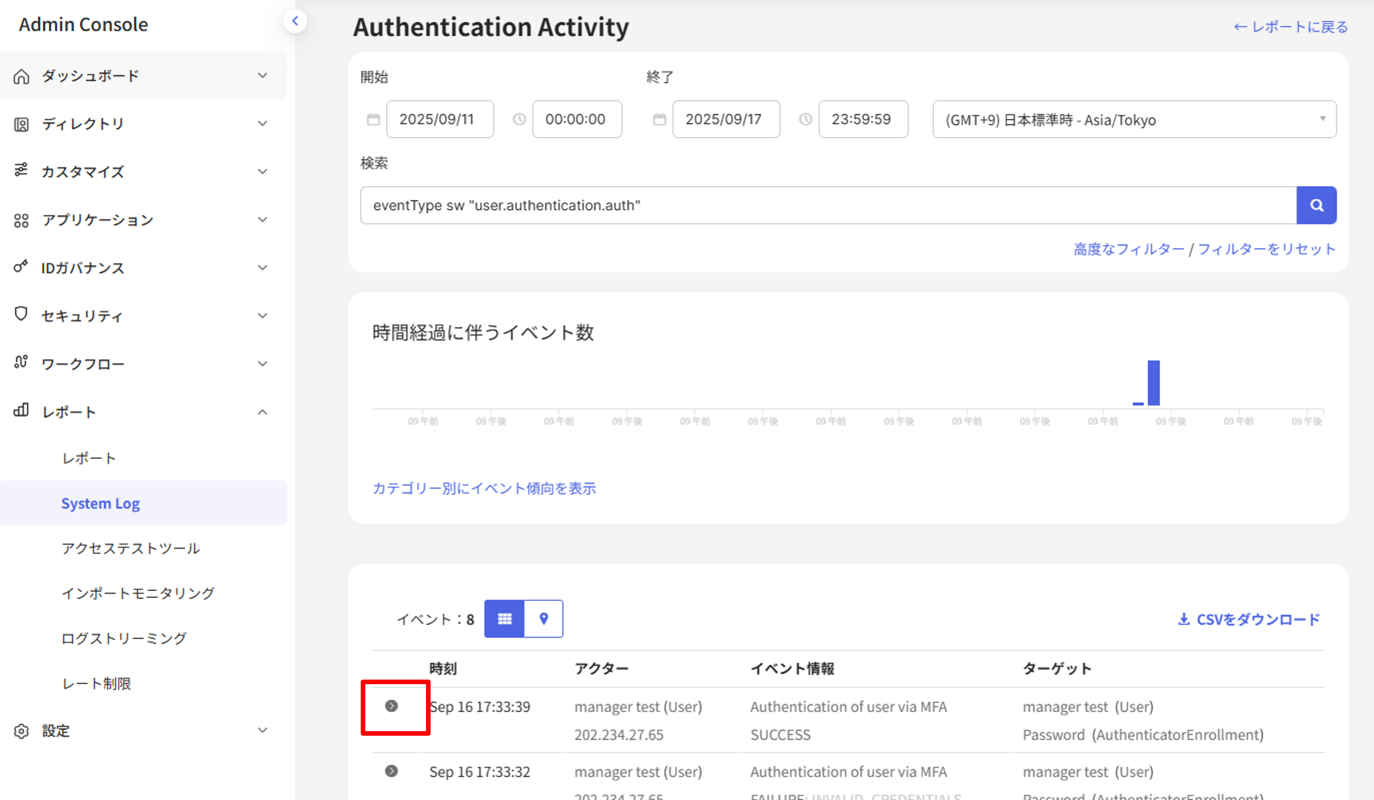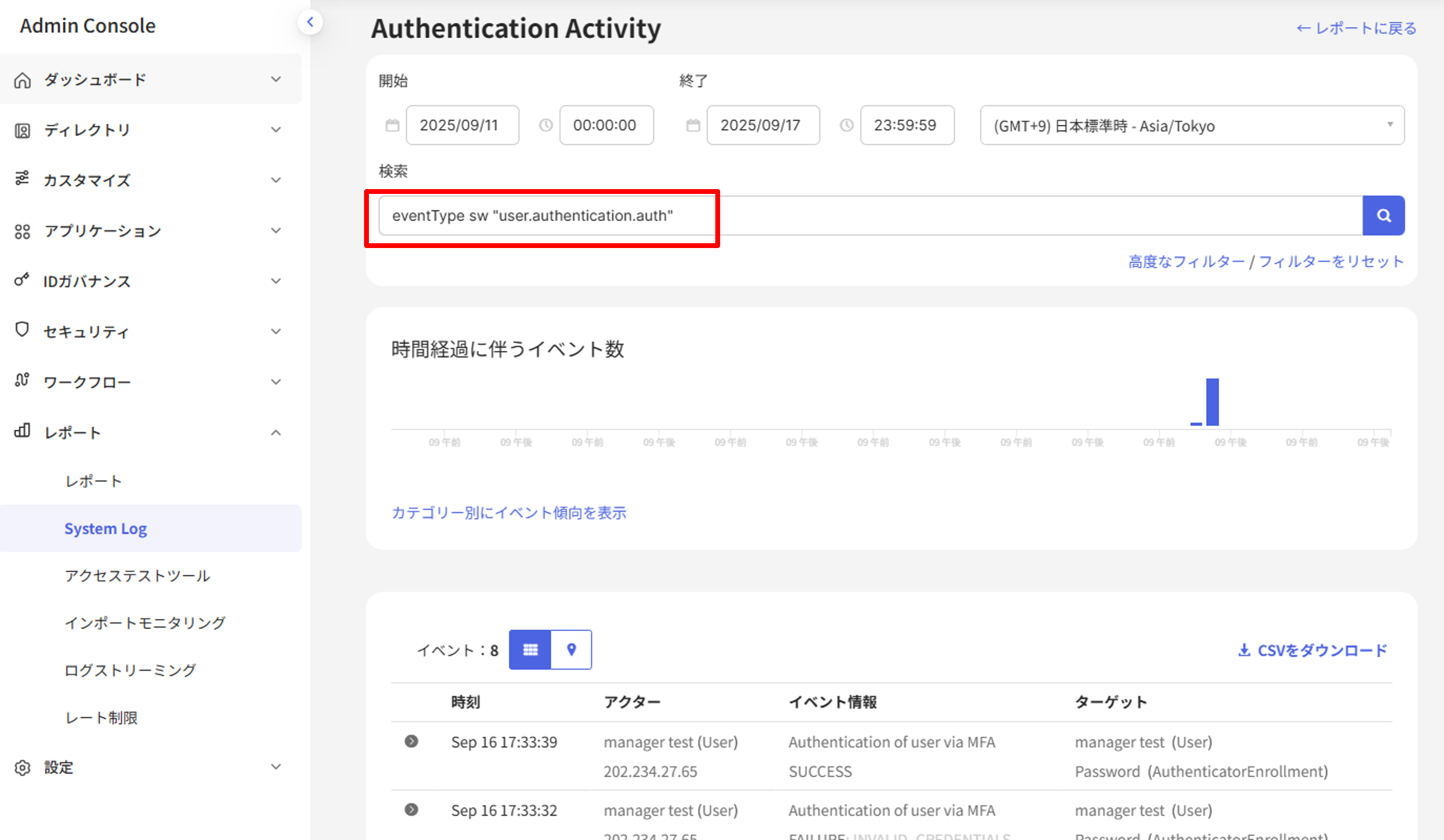 Oktaのログは管理コンソールの[レポート]>[System Log]より確認できます。