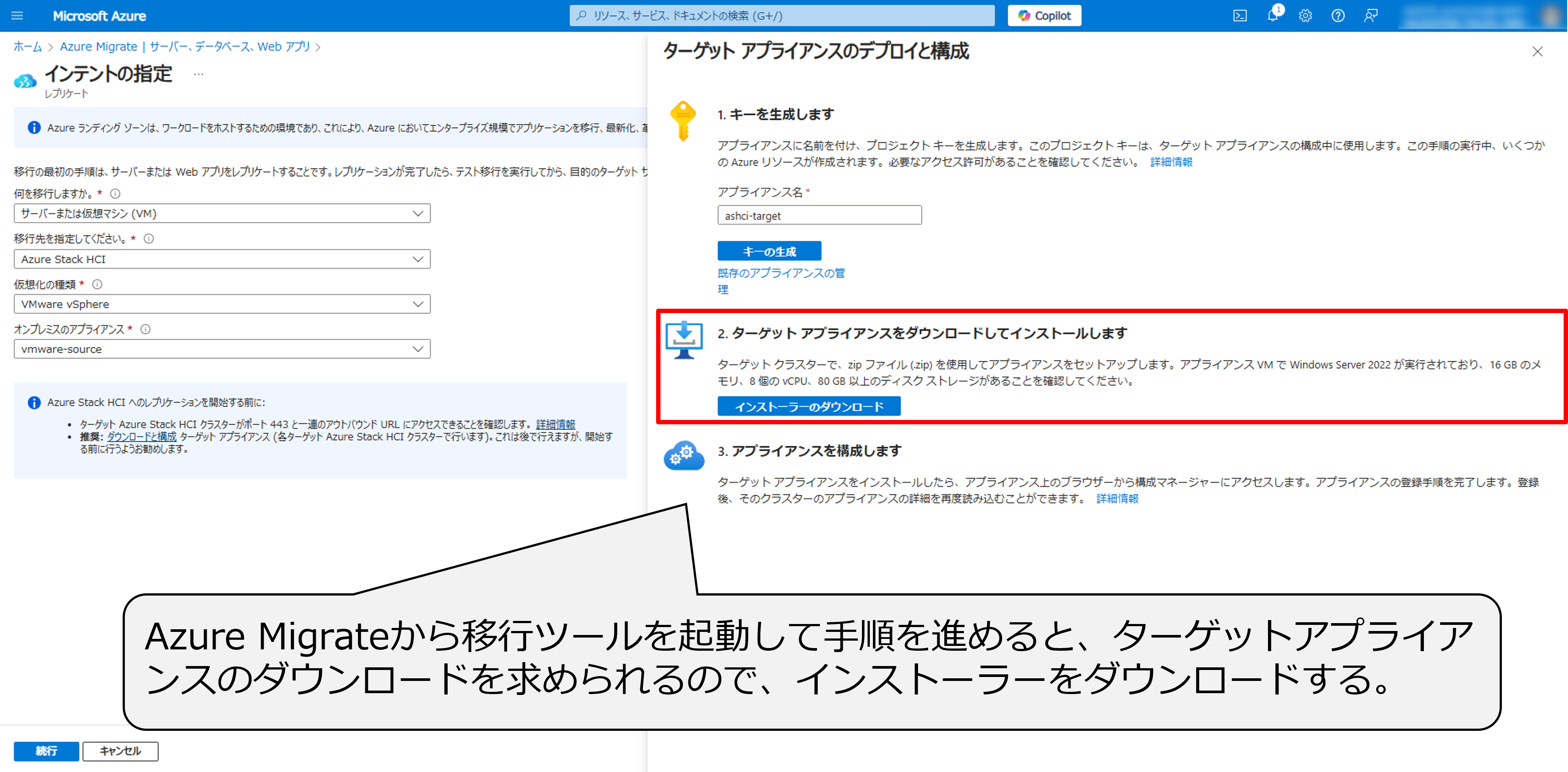続いて、Azure Migrateのレプリケートステップを実行し、移行先のAzure Local基盤の検出を行います。Azure Local上にデプロイするTarget Applianceのファイルは、ウィザードを進める中で取得できます。
