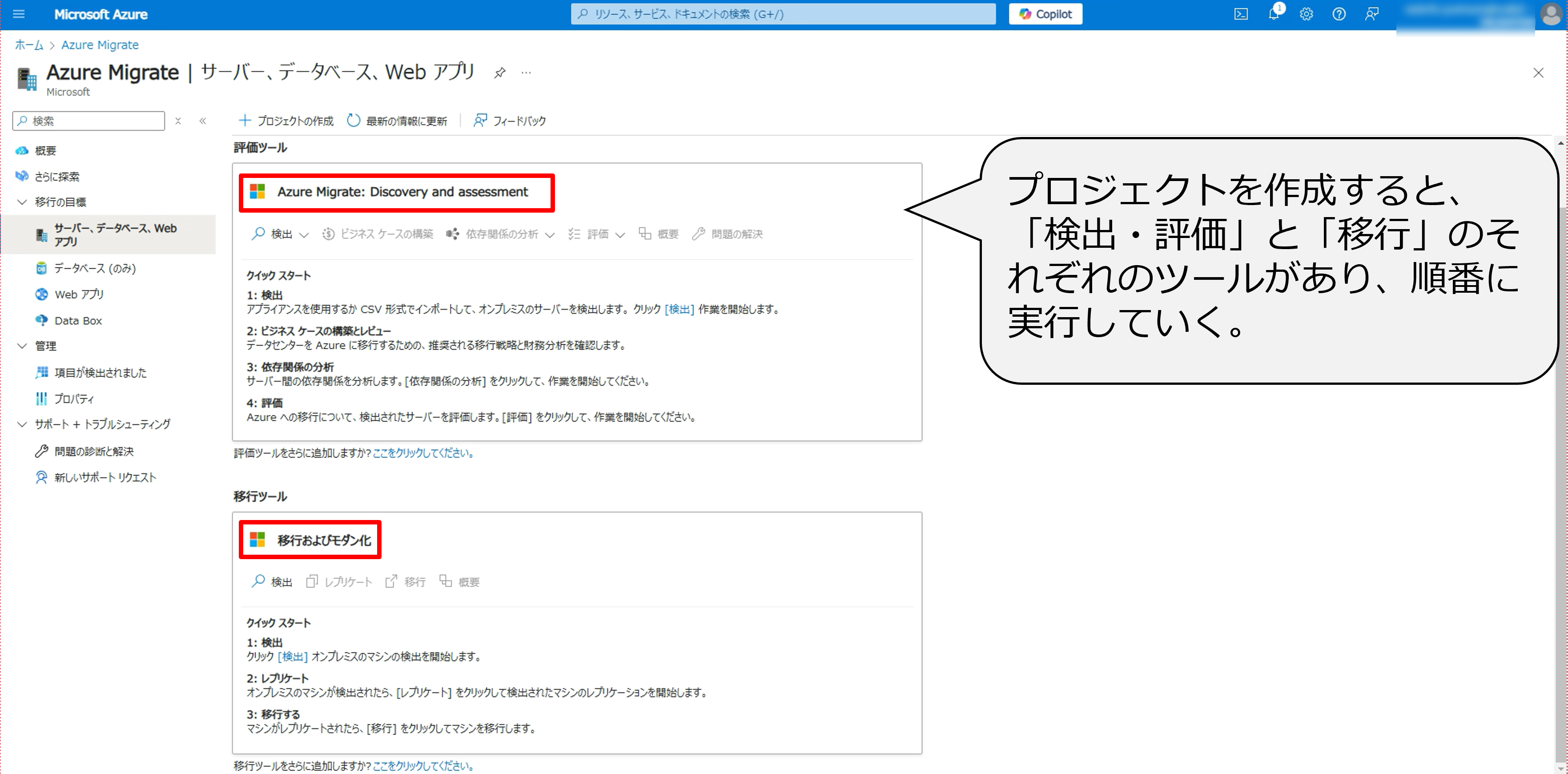 プロジェクト作成後は、「検出・評価」と「移行」のそれぞれのツールがあり、順番に実行していくことになります。