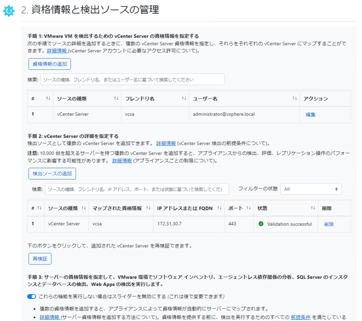 Source Applianceをデプロイした後は仮想マシンにログインし、管理系ネットワークのIPアドレスを手動で割り当てます。設定したIPアドレスにブラウザでアクセスすると、検出用のウィザードが開きます。わかりやすく手順が指示されていますので、手順に従い移行元のVMware基盤を検出します。