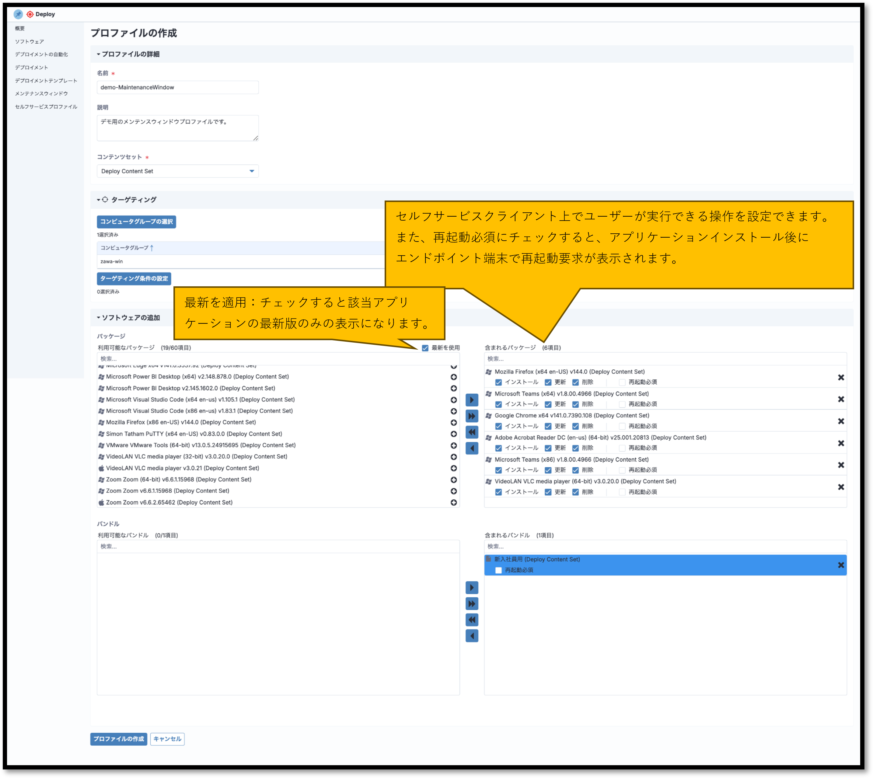 まずは左のメニューから[Module > Deploy > セルフサービスプロファイル]へ遷移しましょう。![]()