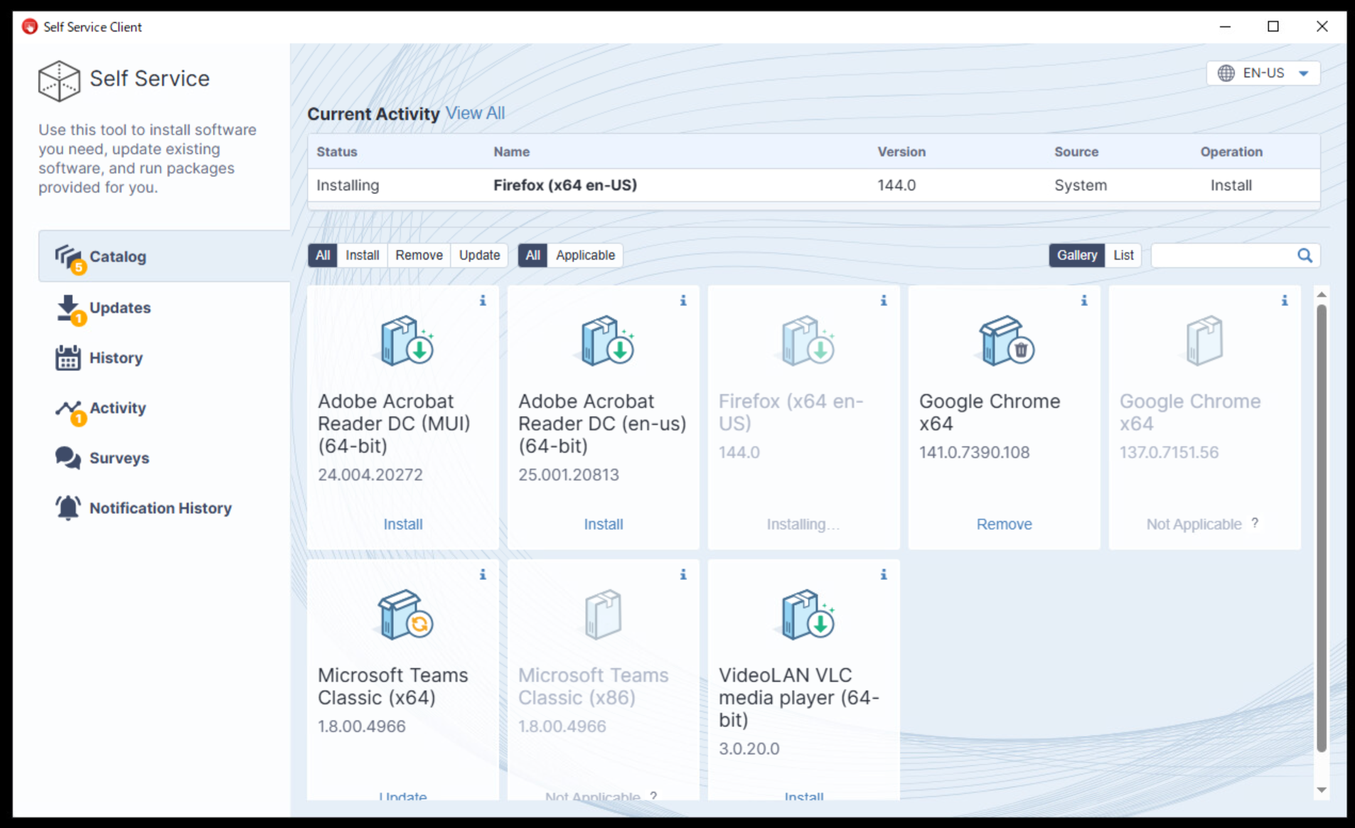 PC上でクライアントのウィンドウを開けば、管理者が登録しているアプリケーションを環境にインストールしたり更新したり削除したりできる機能です。