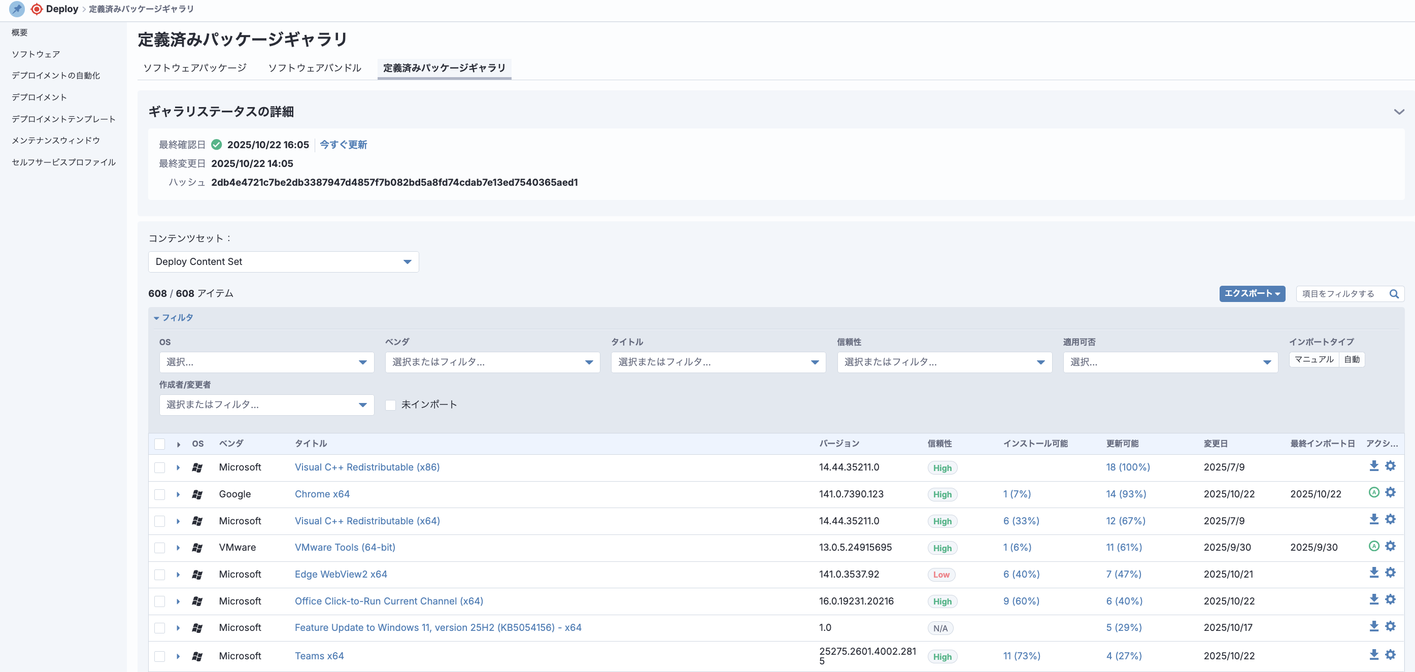 画面内ではパッケージの普及率や、ソフトウェアの状態(未適用の更新有無)も確認できます。