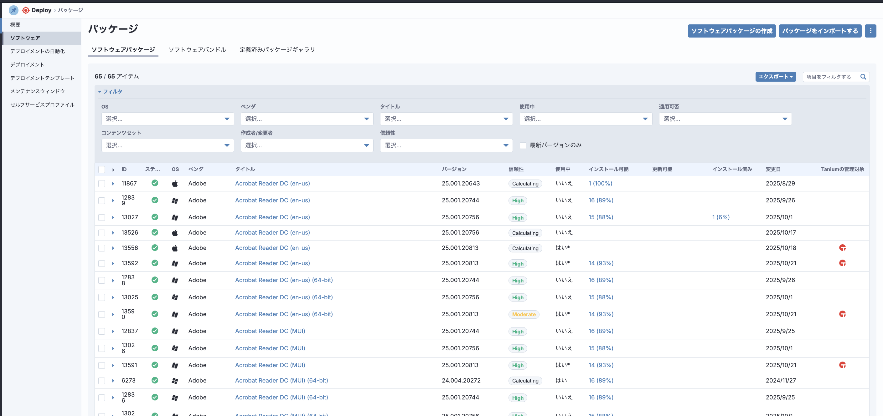 こちらの画面からソフトウェアのインポートや自動インポートの設定(新しいバージョンのソフトウェアが出た際に自動でTanium上にインポートする)が可能です。