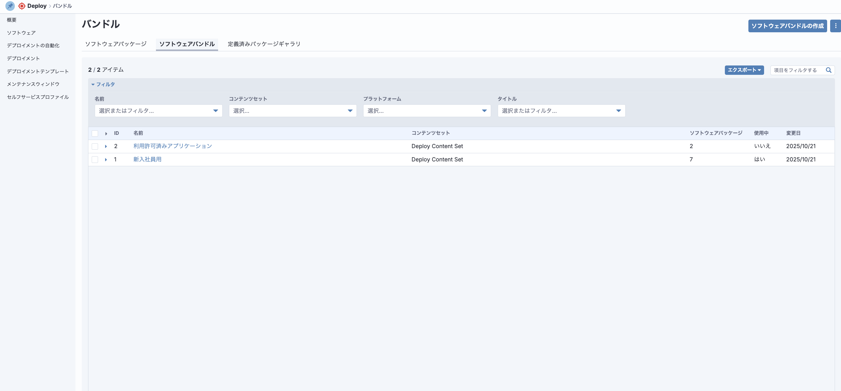 上記のソフトウェアパッケージにあるソフトウェアをユーザー任意のバンドルにして利用できるようにする機能です。「~部署用」や「新規端末構築用」など、用途に合わせた使い方ができます。複数のソフトウェアをDeploy機能の対象にする場合に、個別に選択する手間も省けます。