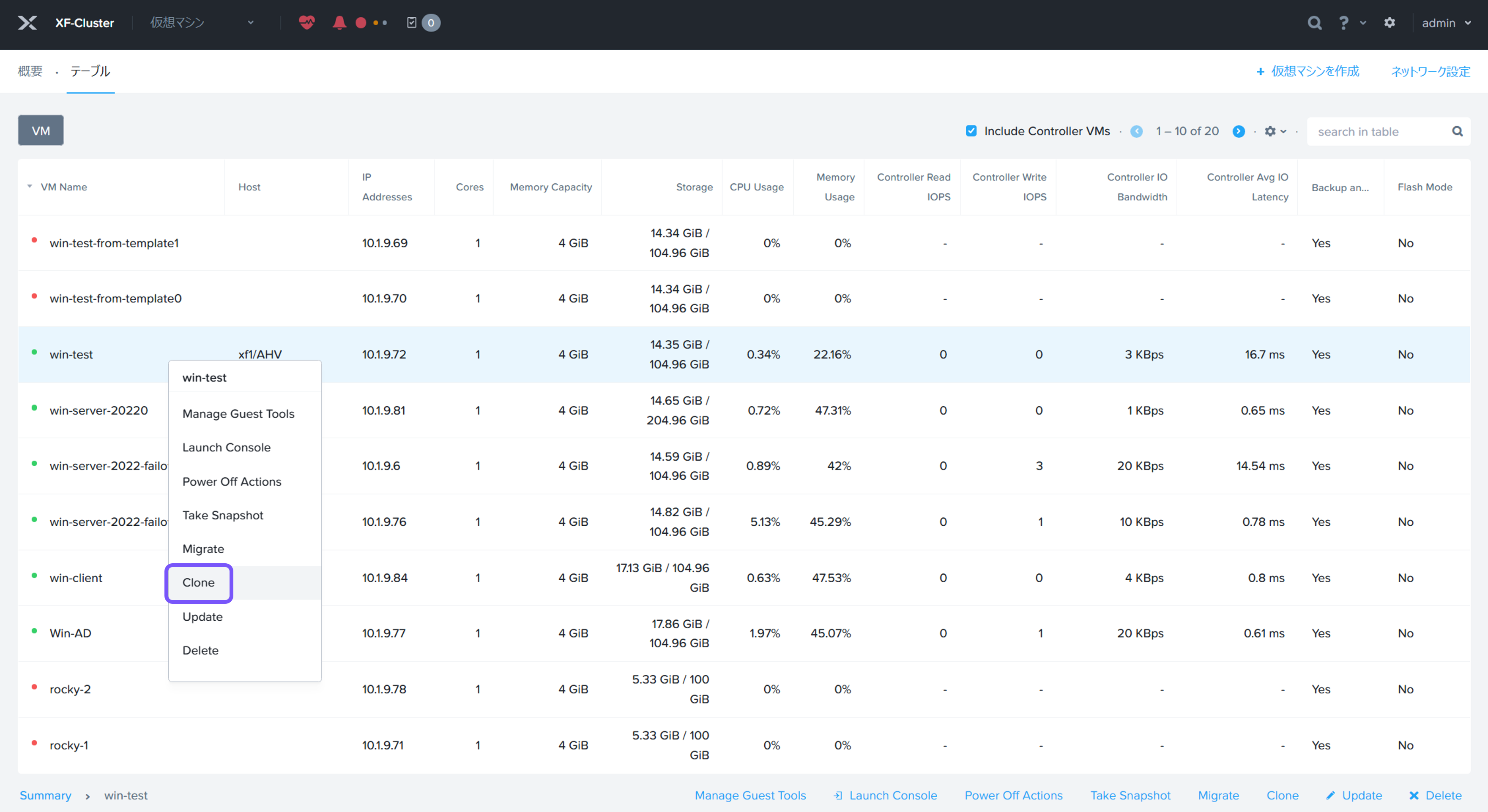 それではさっそく、Nutanix環境でのクローンの実機操作をご紹介します。まずは、Prismの「仮想マシン」画面でクローン対象のVMを右クリックし、「Clone」を選択します。