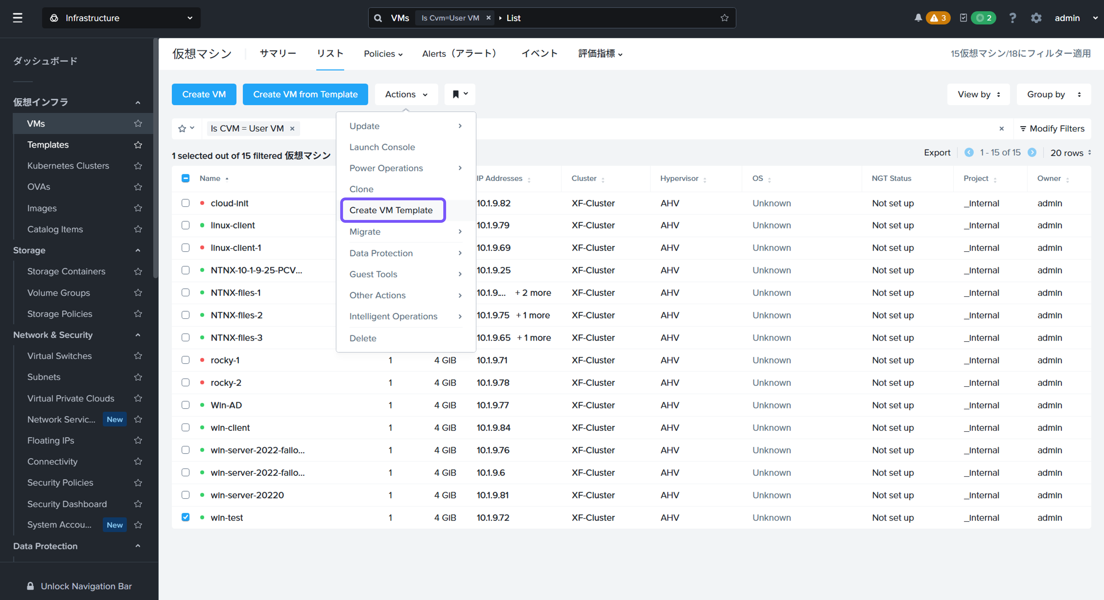 まず、Prism Centralの「VMs」画面で対象の仮想マシンを選択し、「Actions」→「Create VM Template」をクリックします。