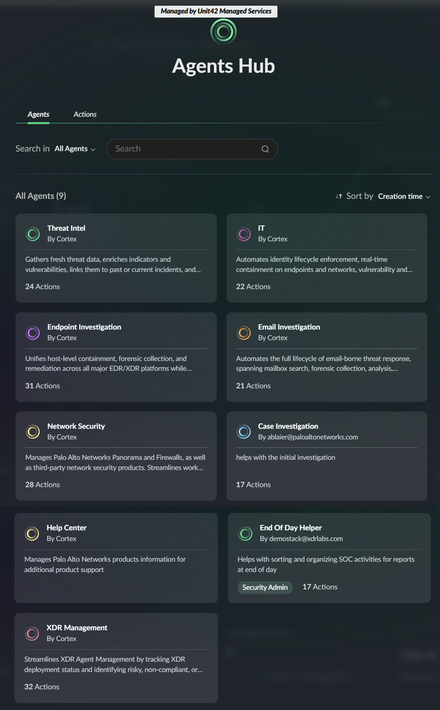 デフォルトでは以下のエージェントが登録されており、脅威インテリジェンスや問題調査、XDR管理など各タスクに特化した内容が定義されています。