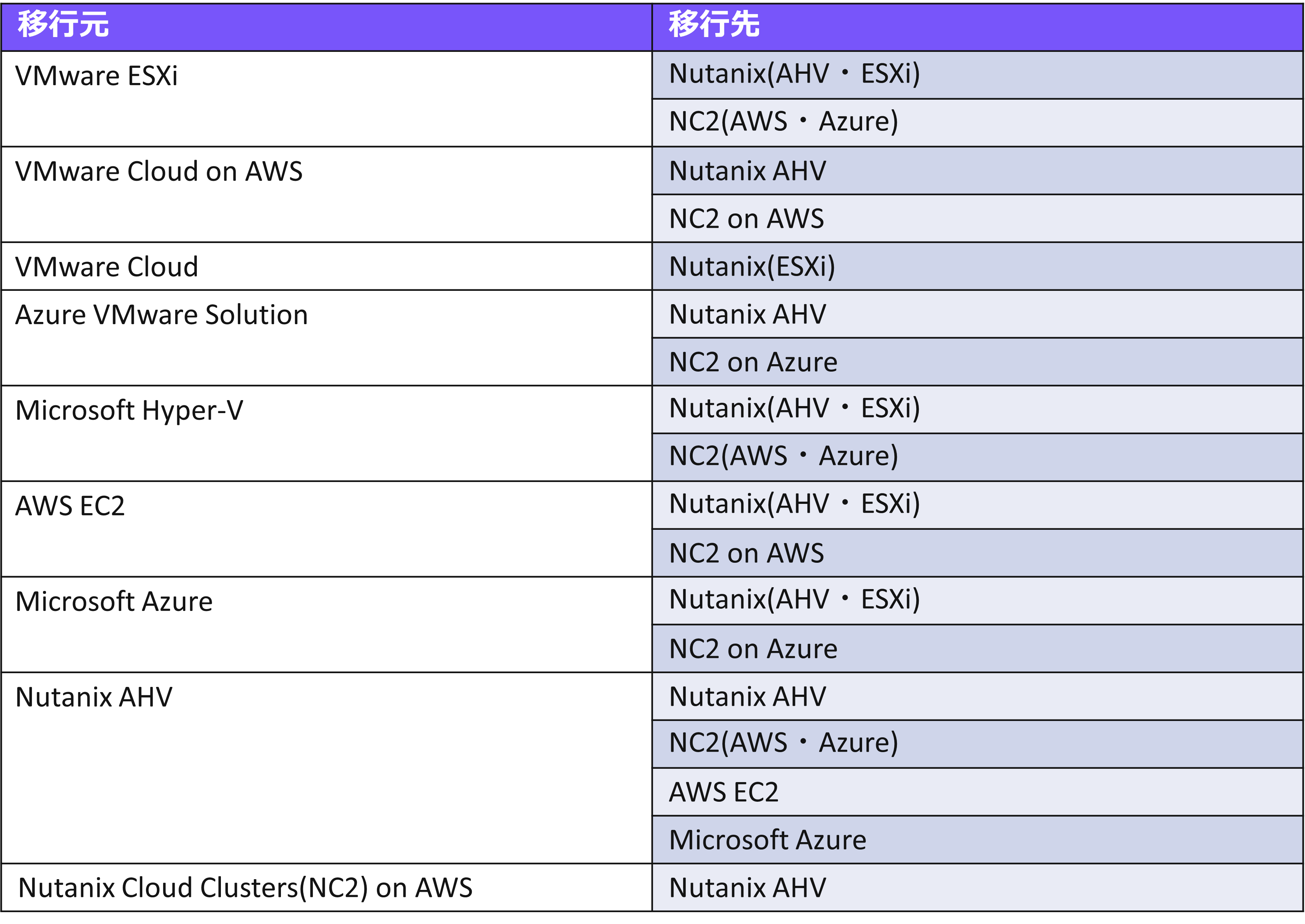 続いて、Moveのサポートしている環境についてご紹介します。Moveの対応している移行元・移行先環境は次の表の通りです。