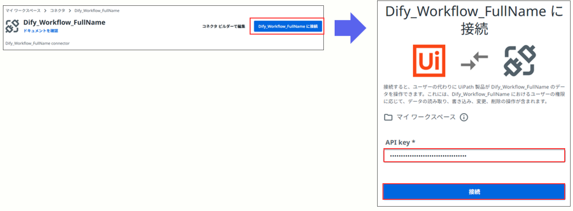 「Dify_workflowに接続」を選択し、「Bearer API Key」(例:Bearer xxx-xxxxxxxxxxxxxxx)を入力し接続