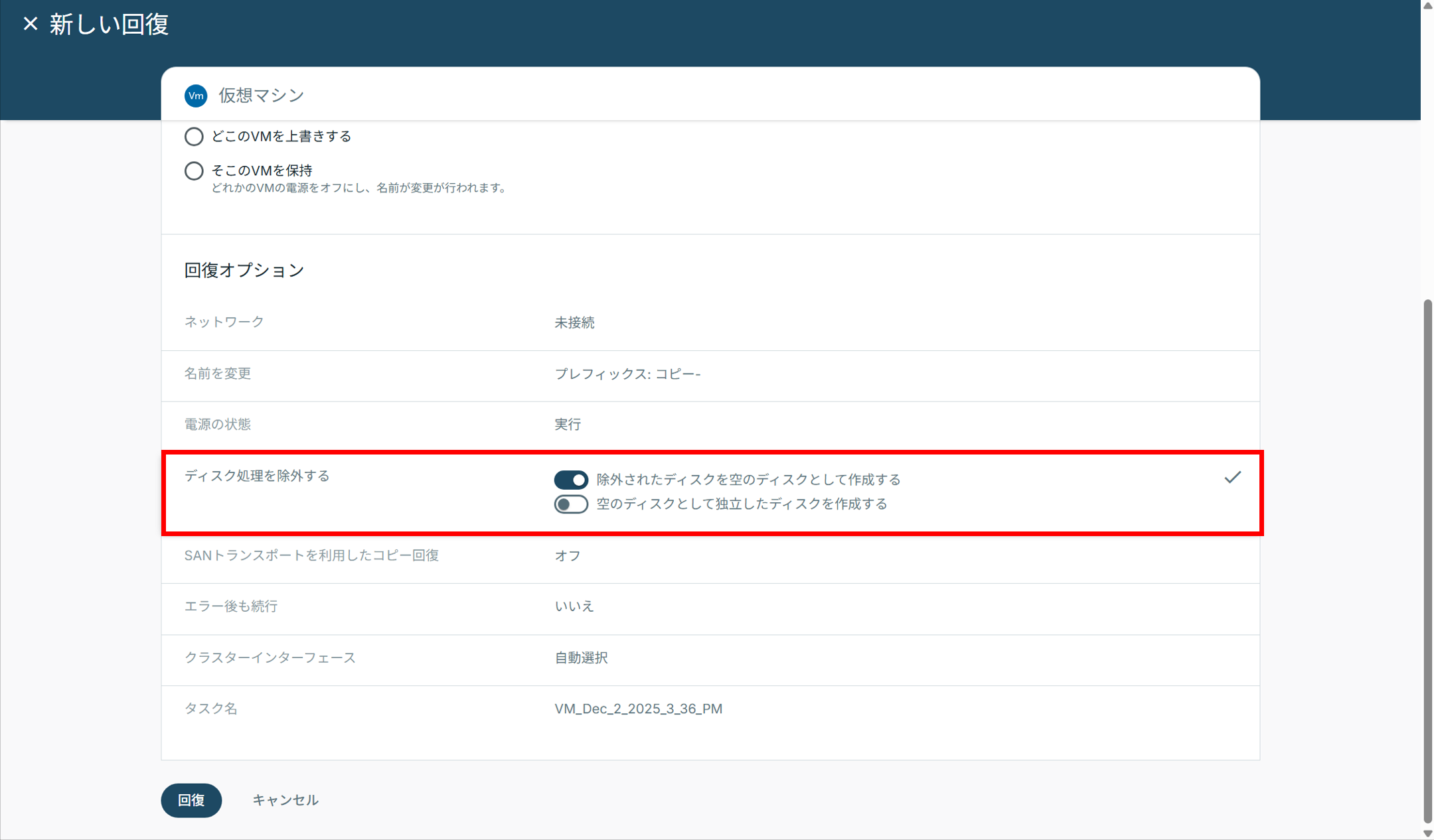 こちらのオプションを適切に設定することで、バックアップから除外したディスクも空のディスクとして復元されるようになるため、アプリケーションやOSが期待するディスク構成を壊さず安全に復元できるようになります。![]()