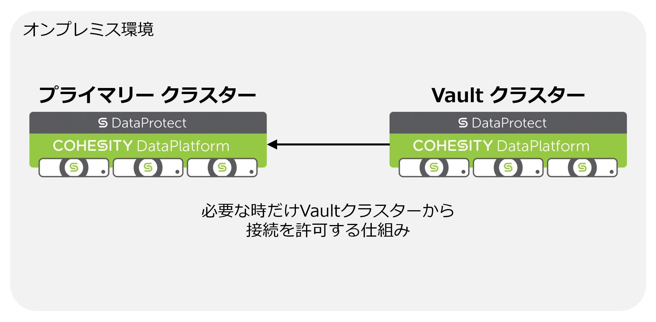 具体的な利用方法はCohesityのクラスターを2つ用意していただき、一方をバックアップクラスター、もう一方をVaultクラスターとして構成することでバックアップクラスターのデータをVaultクラスターが保管する構成となります。FortKnox Self-Managedがデータを保管する仕組みはpull-based modelとなっており、エアギャップネットワークからのアウトバウンド接続のみを利用し、外部からの不正アクセスを遮断します。![]()