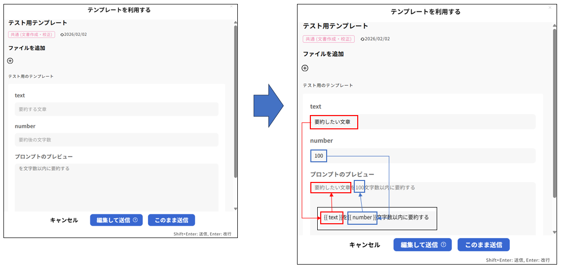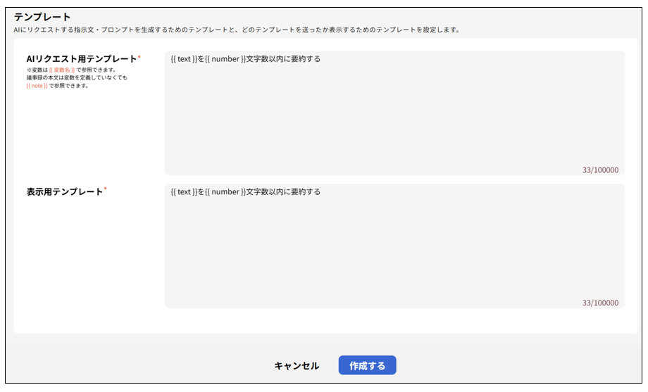 そのため、AIリクエスト用テンプレートと表示用テンプレートは同じ文章を設定してください。