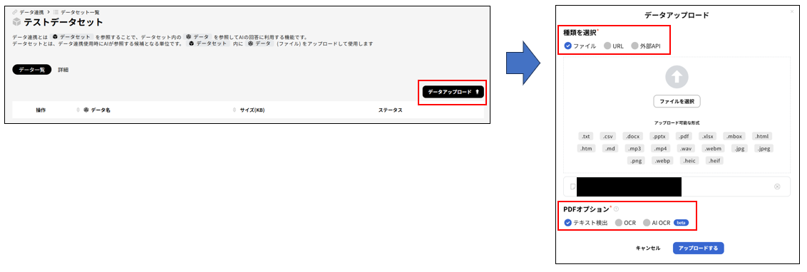 1. Excel・PDFファイルをアップロードしたデータセットを用意し、
