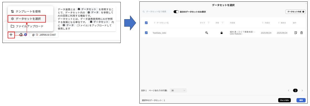3. 対象のデータセットを選択し、「適用」ボタンをクリック