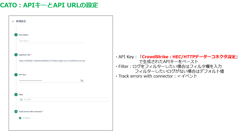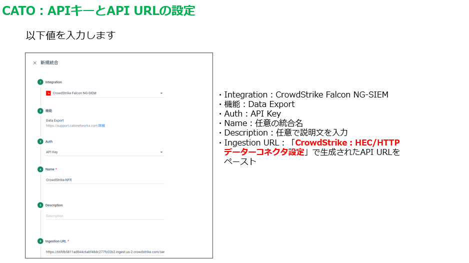 Integratrionとして「CrowdStrike Falcon NG-SIEM」を選択し、必要となる情報を設定します。設定欄のIngestion URLには「HEC/HTTPデータコネクター」で生成されたAPI URLを、API KeyにはAPIキーを貼り付けてください。