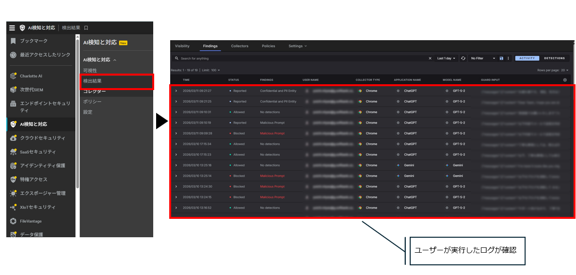 管理コンソールでも確認してみましょう。「AI検知と対応」>「検出結果」からユーザーのログが確認できます。