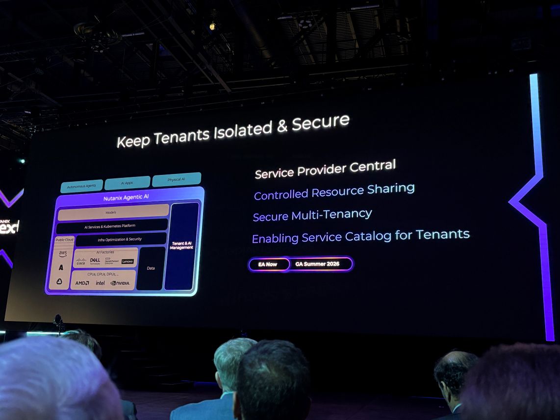 2026年3月に実施されたNVIDIA GTC 2026の開催タイミングで、Nutanix社が新たに発表した「Nutanix Agentic AI」について改めて紹介がありました。基盤ハードウェアの上に、AIサービスとKubernetes、最適化された基盤インフラ、データ処理、そしてマルチテナント管理といった要素が、ひとつのスタックとして語られていました。