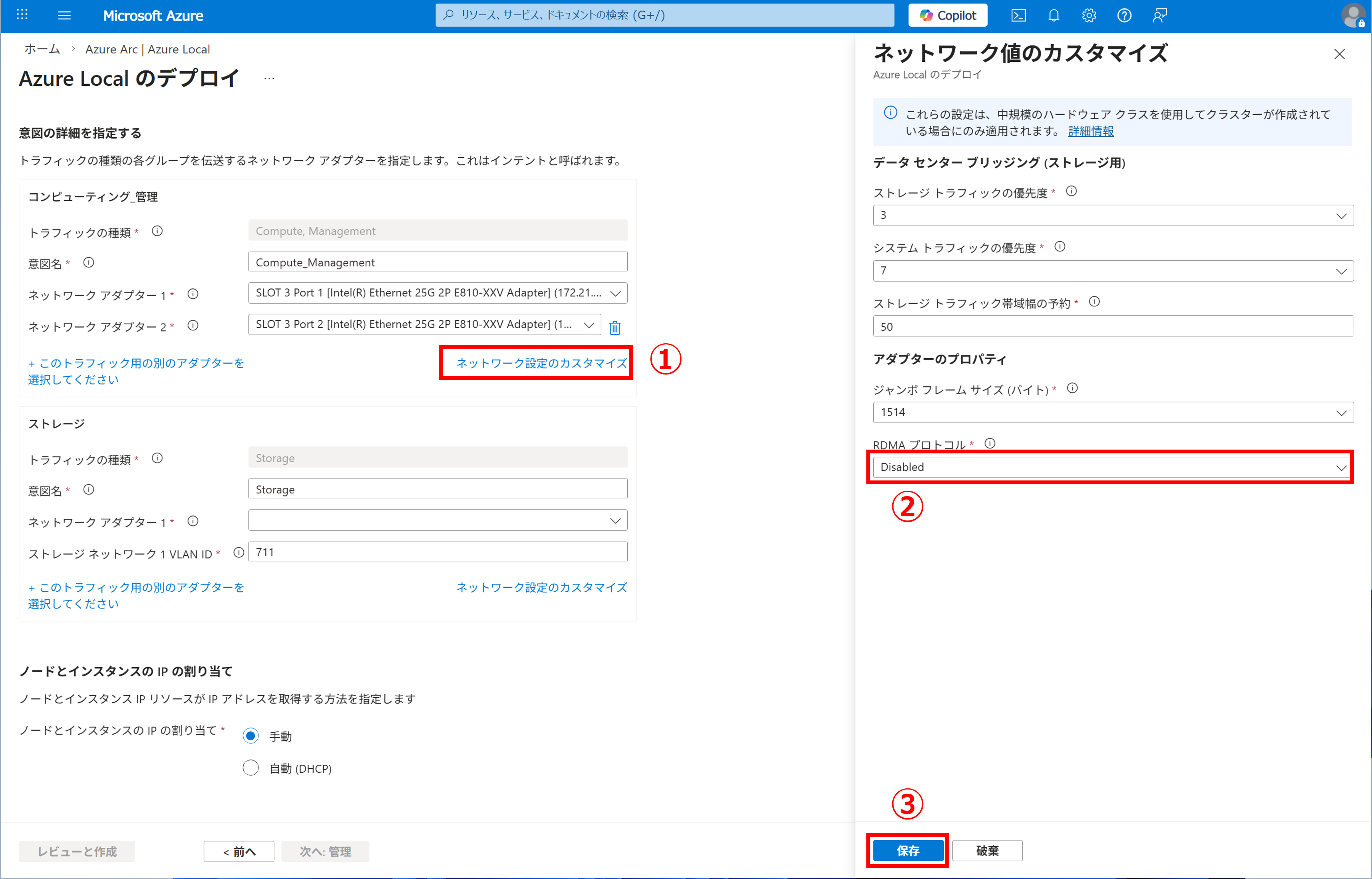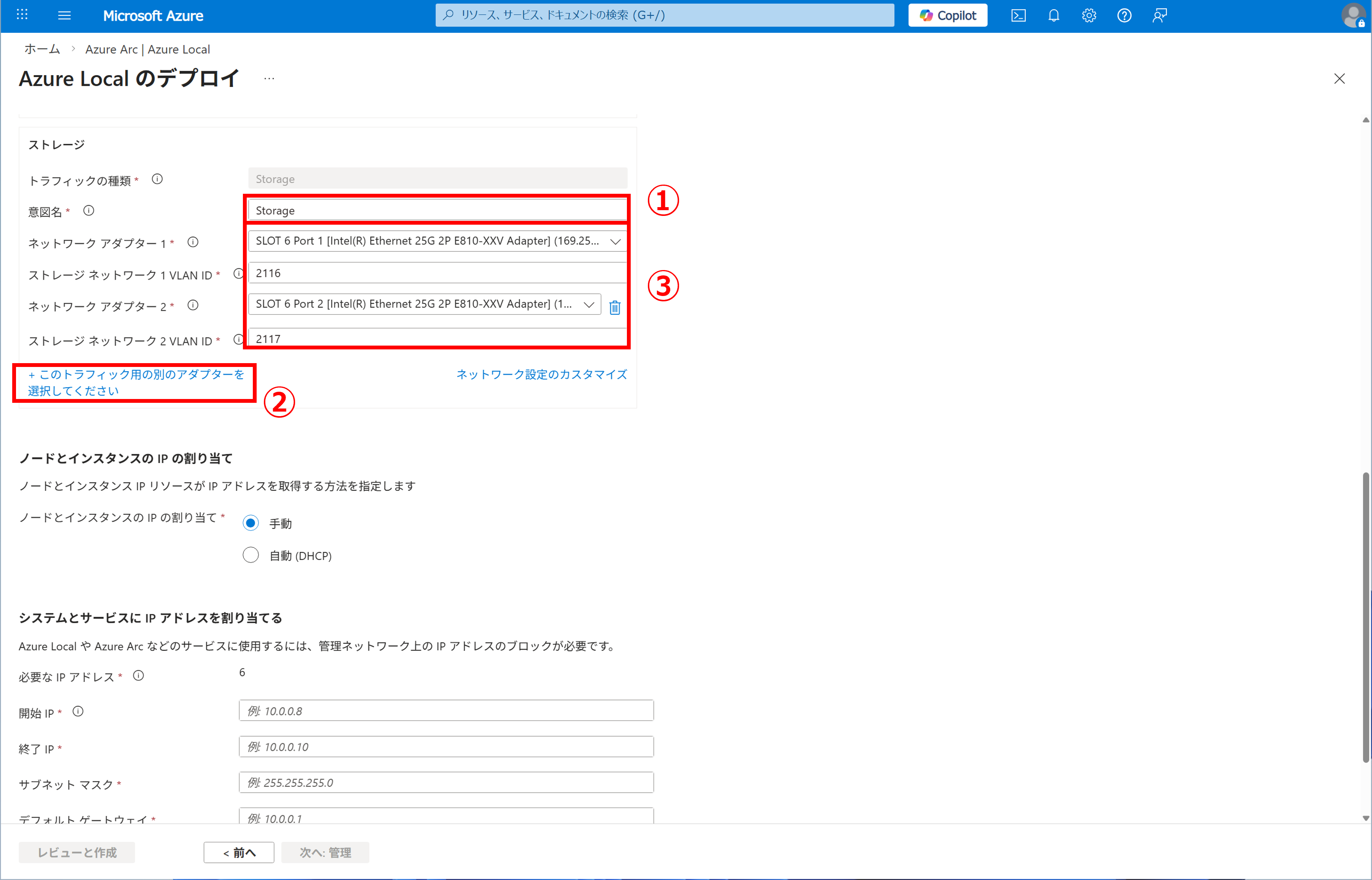 ※Azure Localの場合、ストレージトラフィック用のIPアドレスをこれまでのステップで設定していませんでしたが、ネットワークATCが自動的にIPアドレス(内部的なローカルアドレス)を割り当ててくれます。 - インテント(意図)