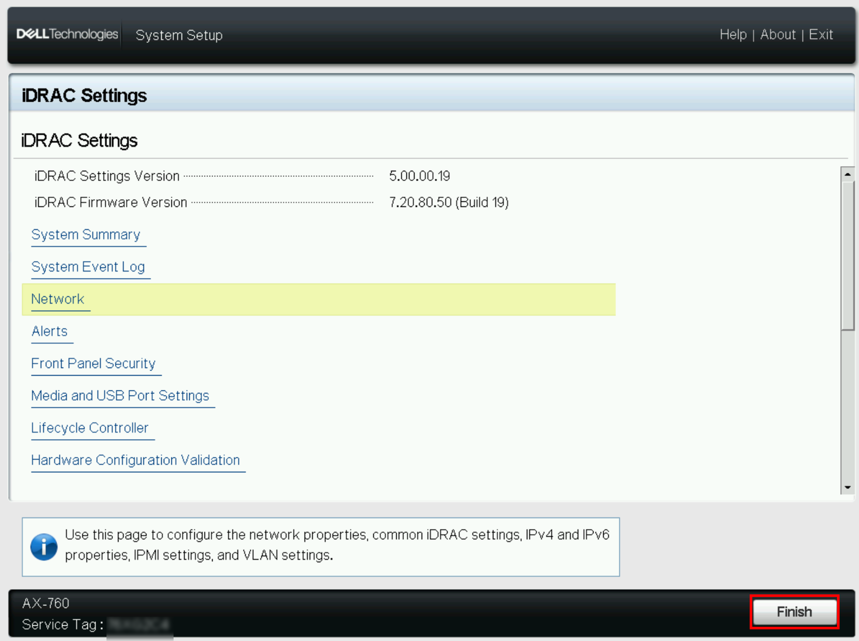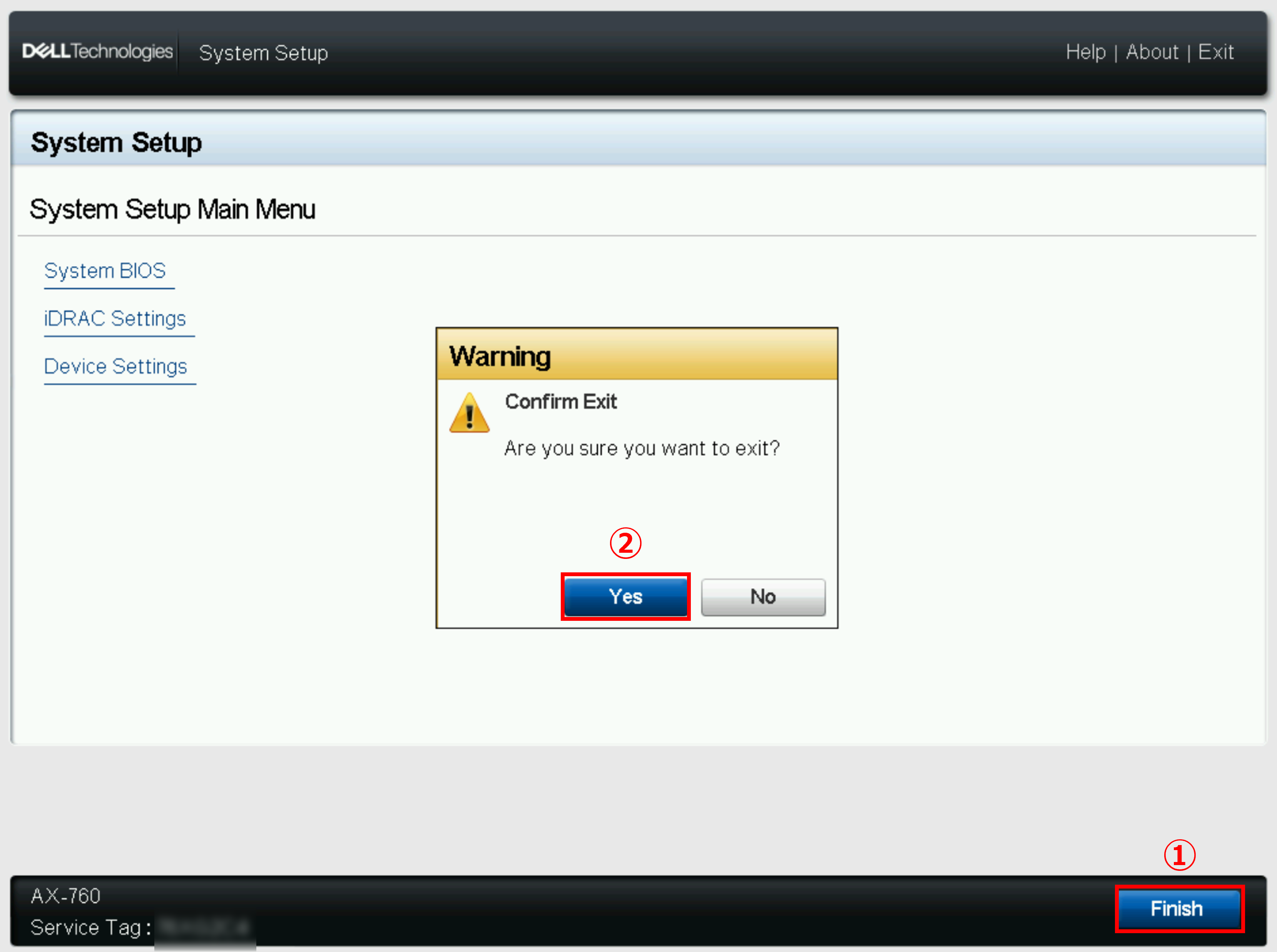 8. [Finish] > [Yes] の順で設定を保存し、System Setupから離脱します。