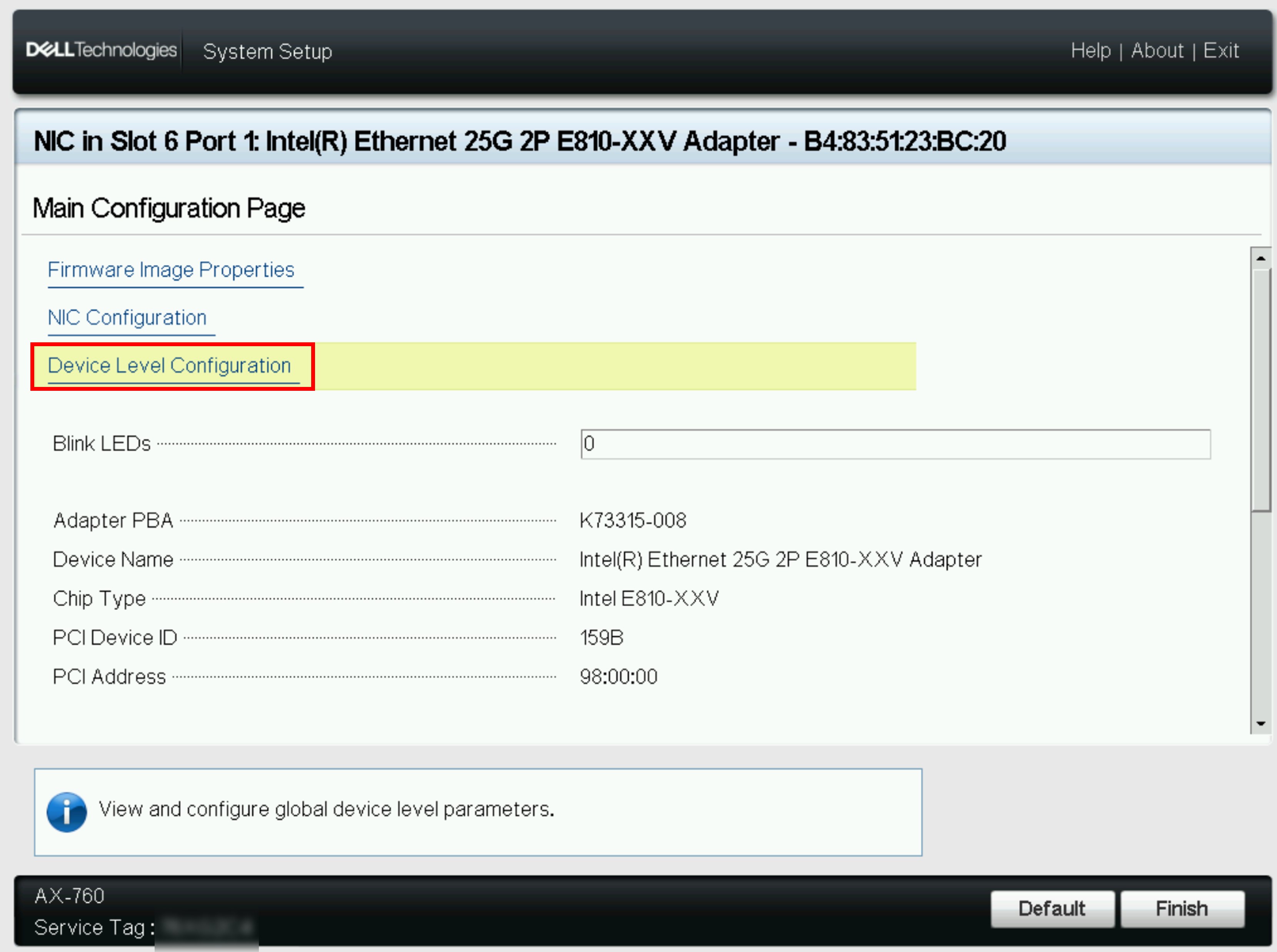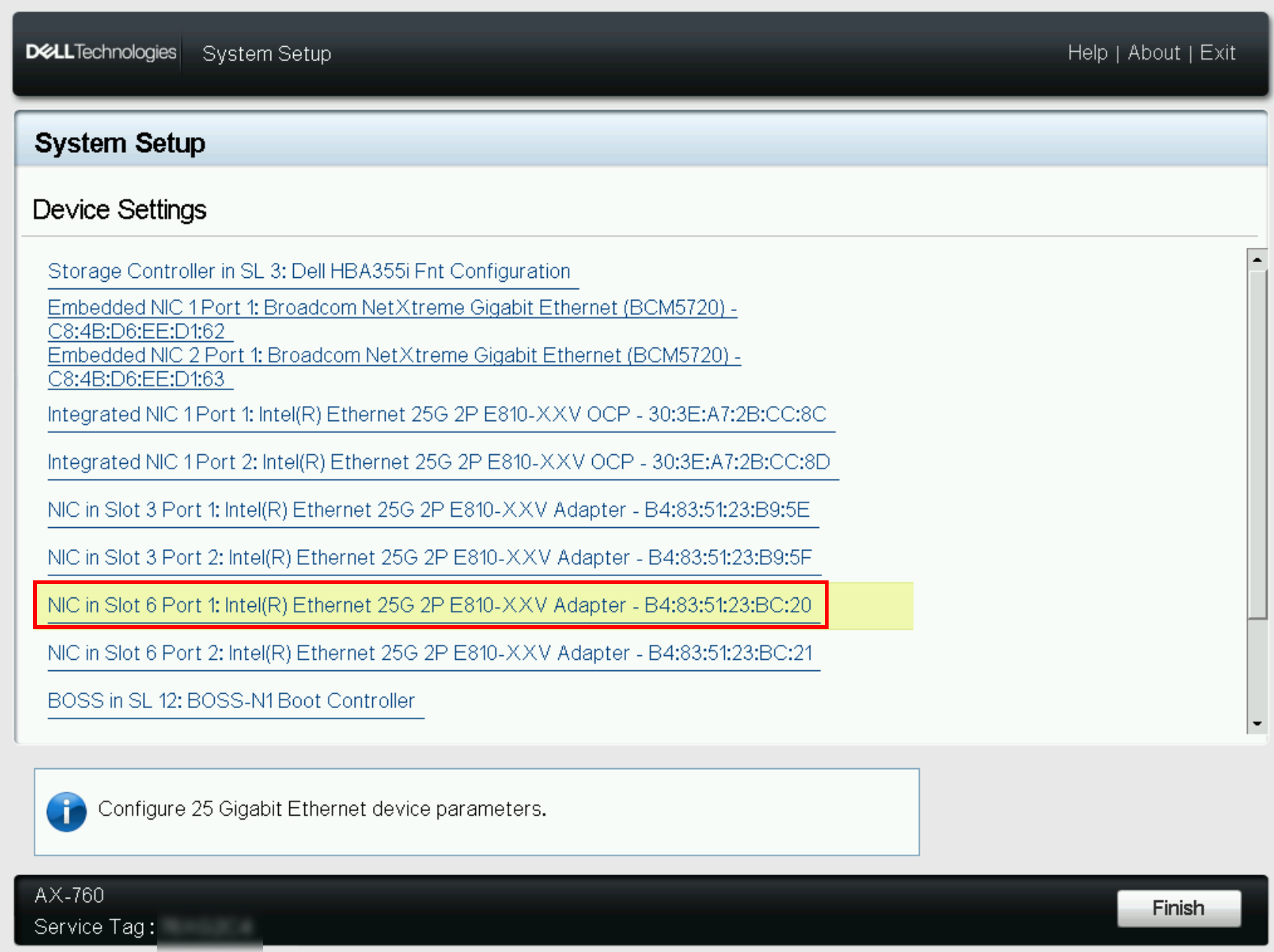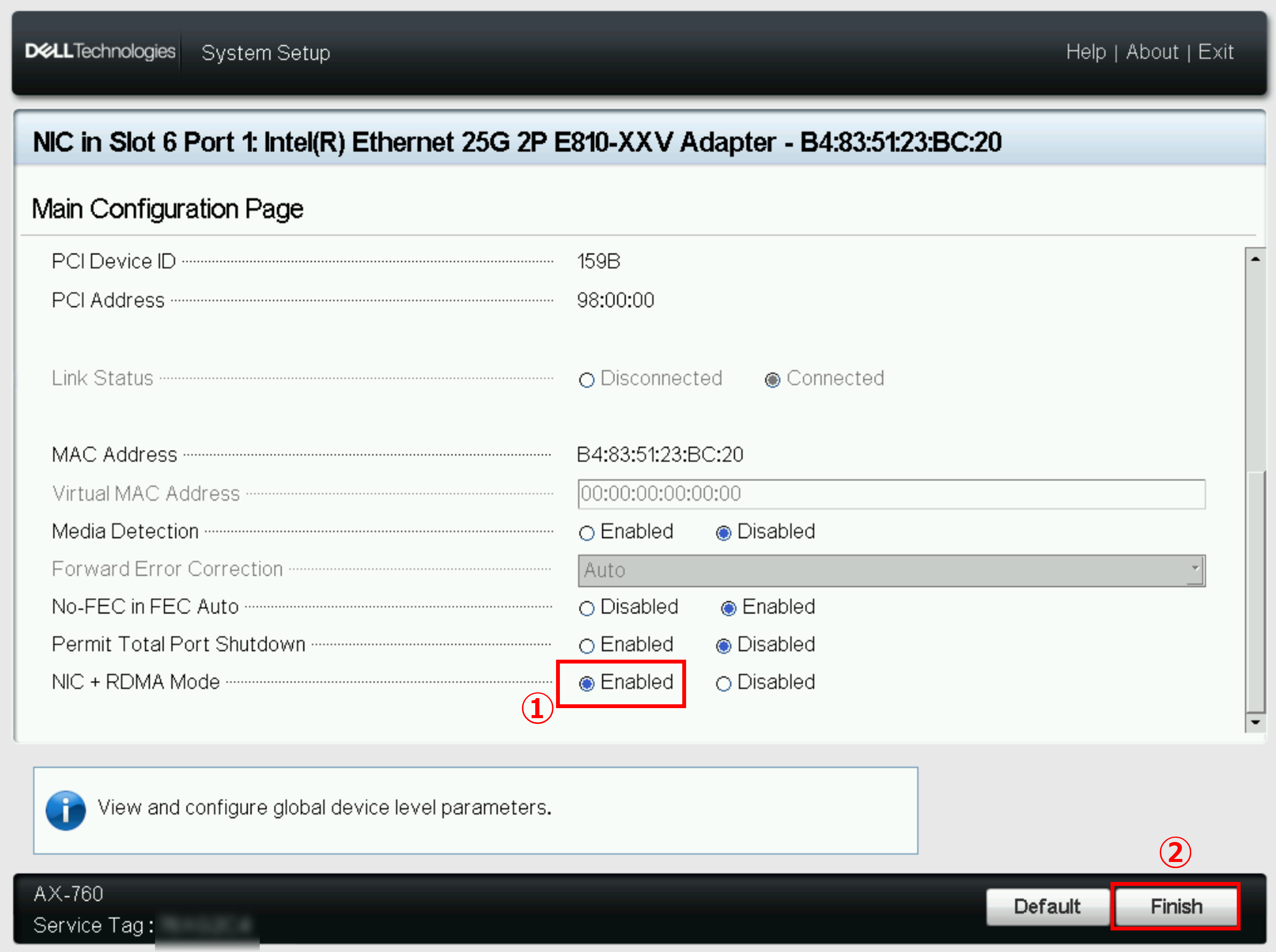 6.「NIC+RDMA Mode」で [Enabled] を選択し、[Finish] をクリックします。