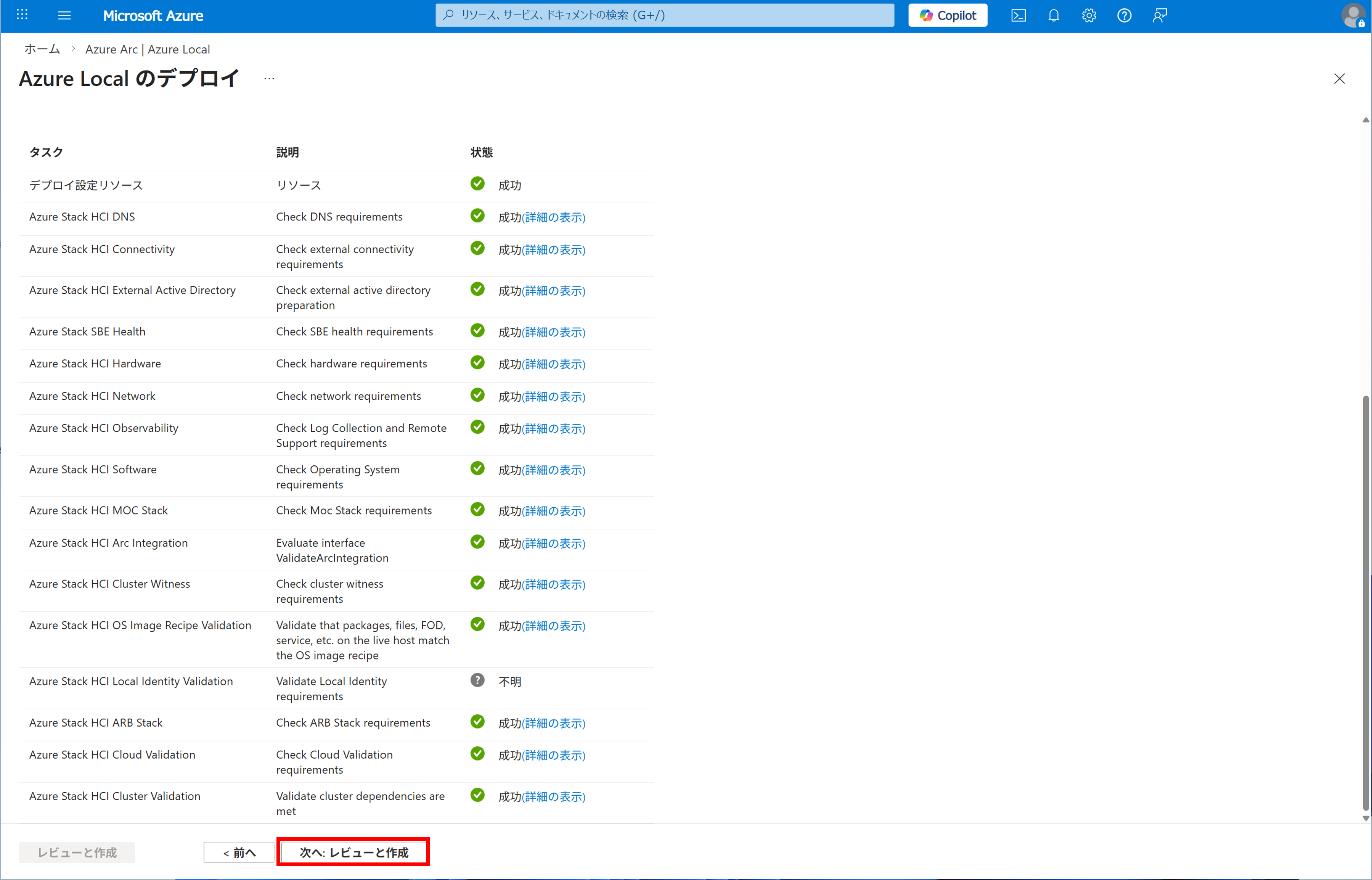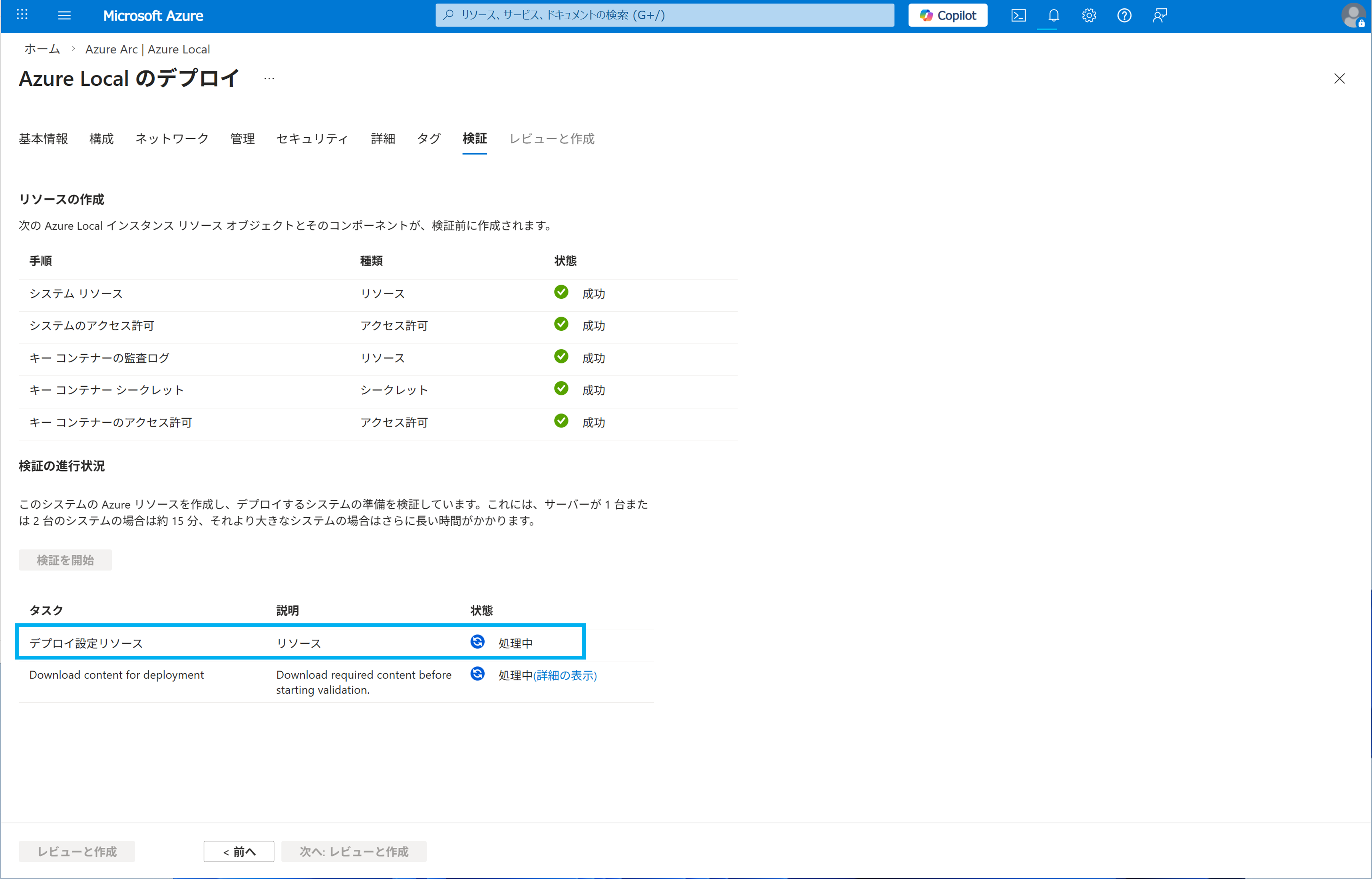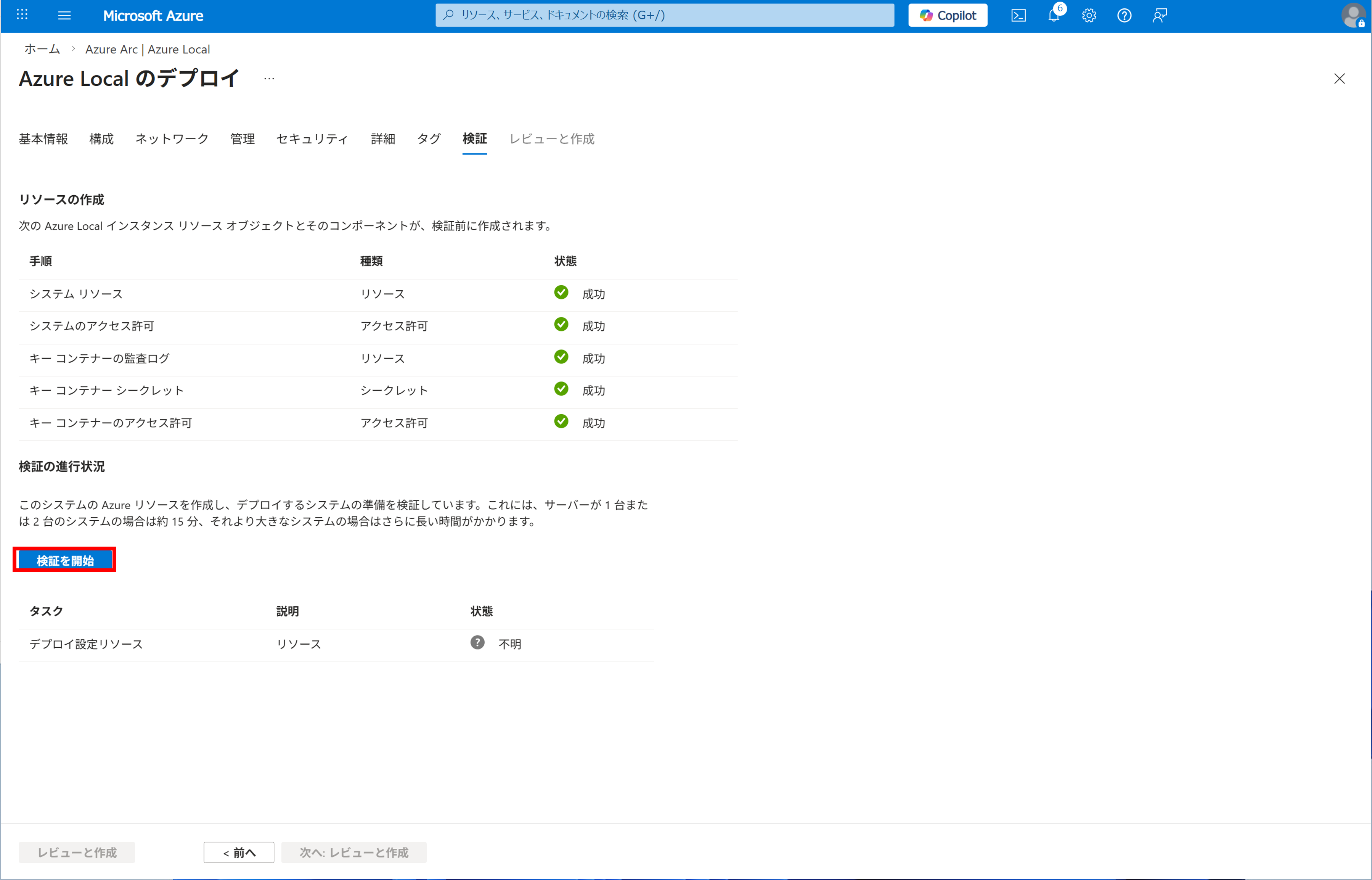 20.「検証」ページに遷移すると、自動でAzure Localに必要なリソースが作成されます。全て作成されたら、[検証を開始] をクリックして検証を開始します。