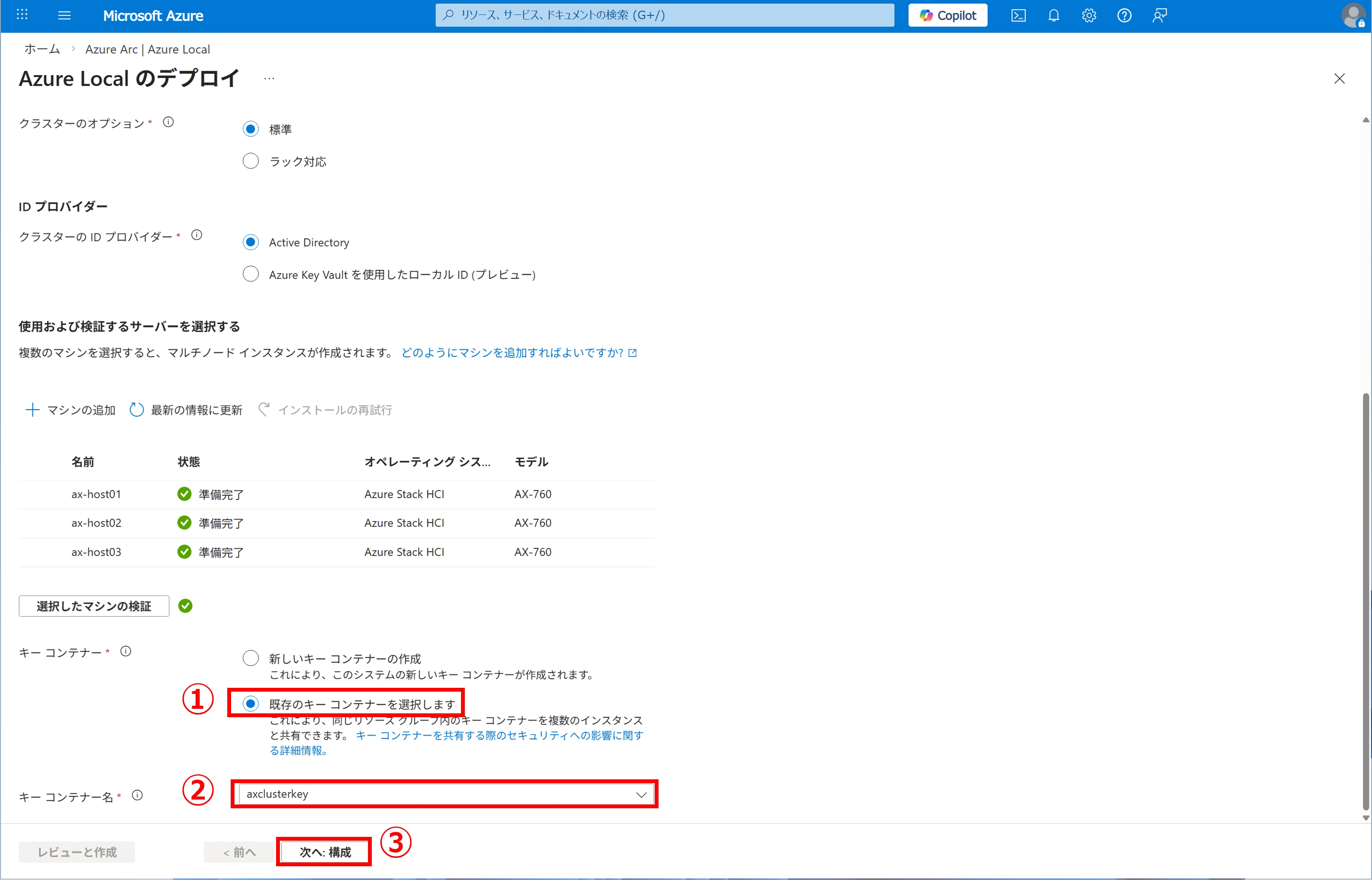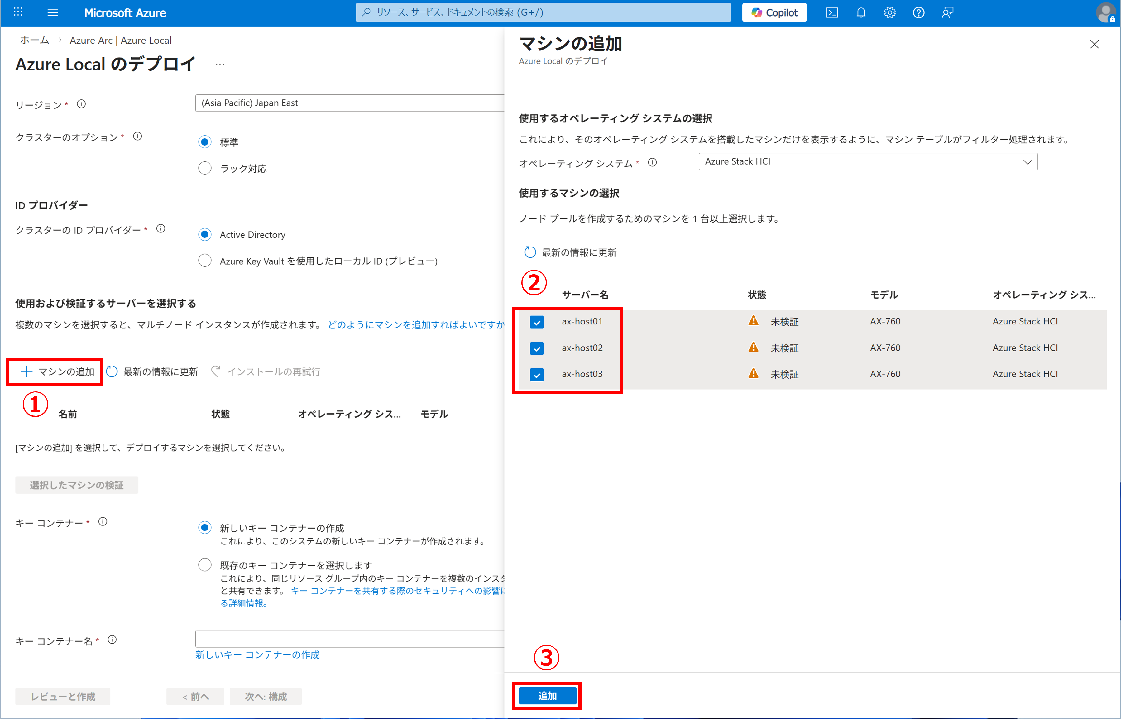 - 事前にAzure Arc登録したホストが全て表示されていることを確認し、クラスターに含む全てのホストを選択します。