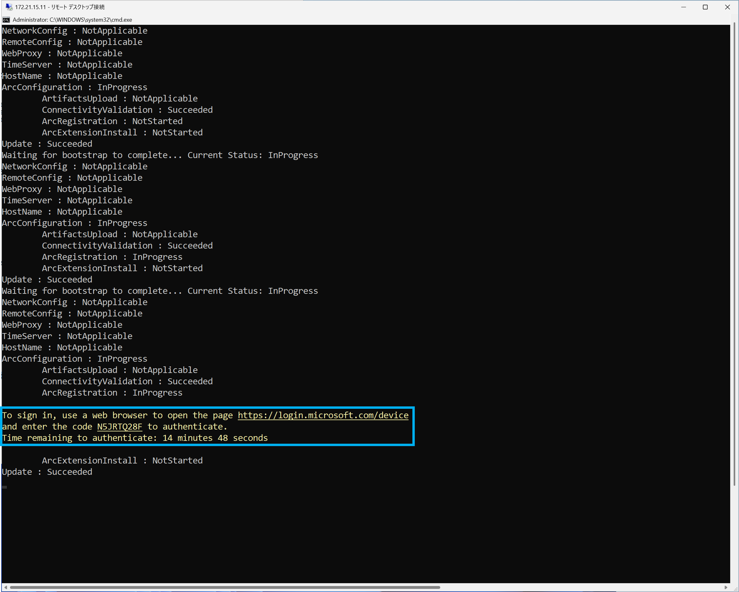 7. PowerShellに戻り、しばらくして「Bootstrap succeeded.」と表示されたらAzure Arc登録の成功です。