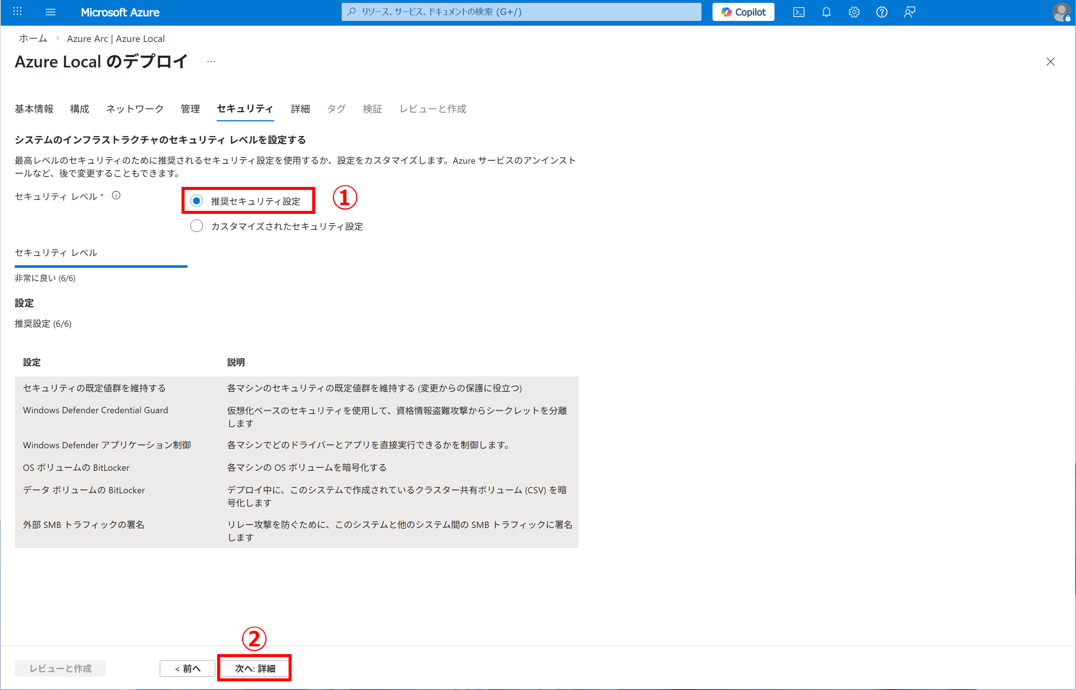 ※カスタマイズすることもできますが、推奨設定に則ることをお勧めします。 - [次へ:詳細] をクリックします。