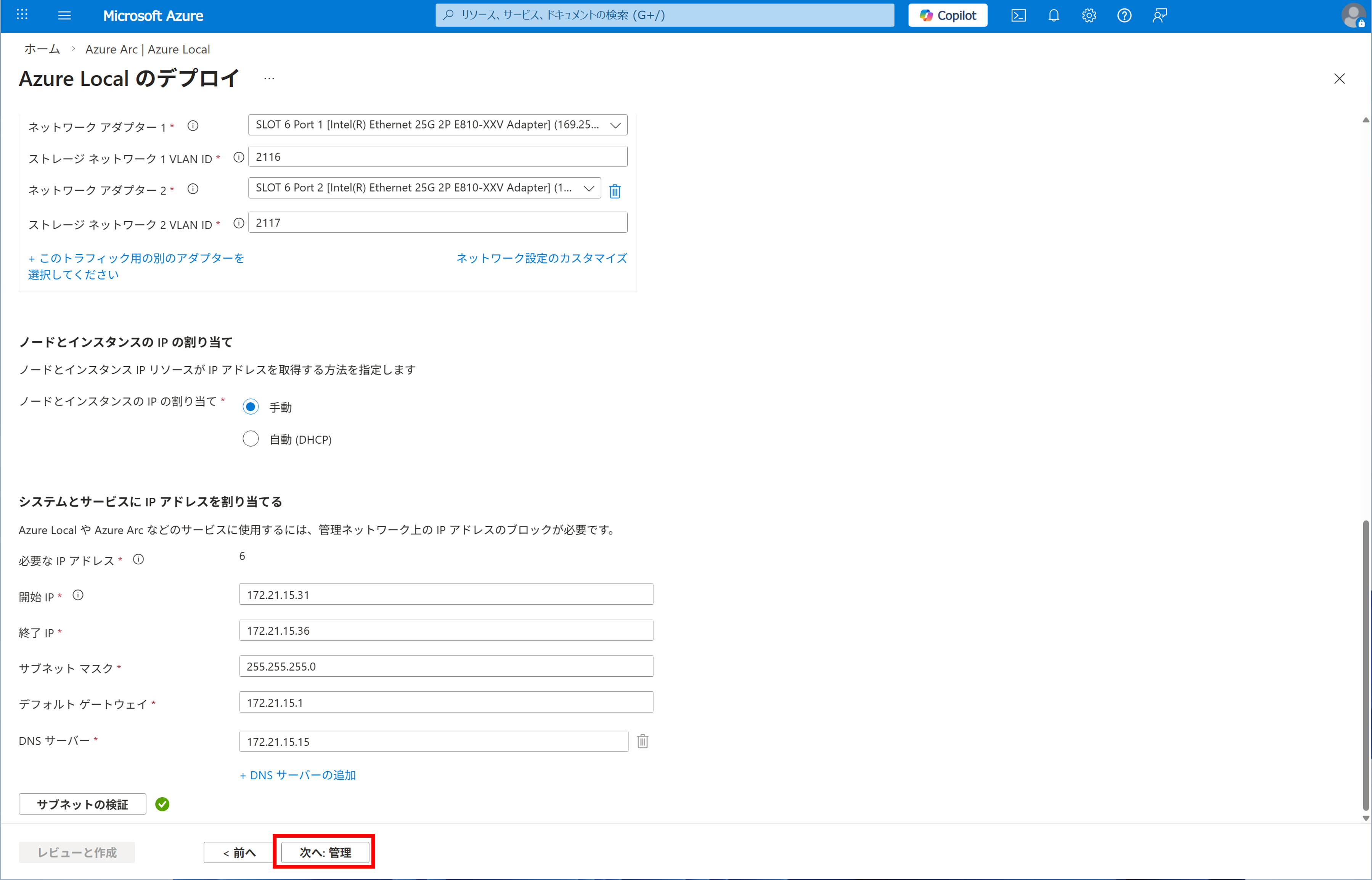 ※これらのIPアドレスは、クラスターIPやAzure Arc連携するために作成されるインスタンスに割り当てられます。デプロイ後に変更はできないため、ご注意ください。 - 「デフォルトゲートウェイ」、「DNSサーバー」についても事前に用意したものを入力します。