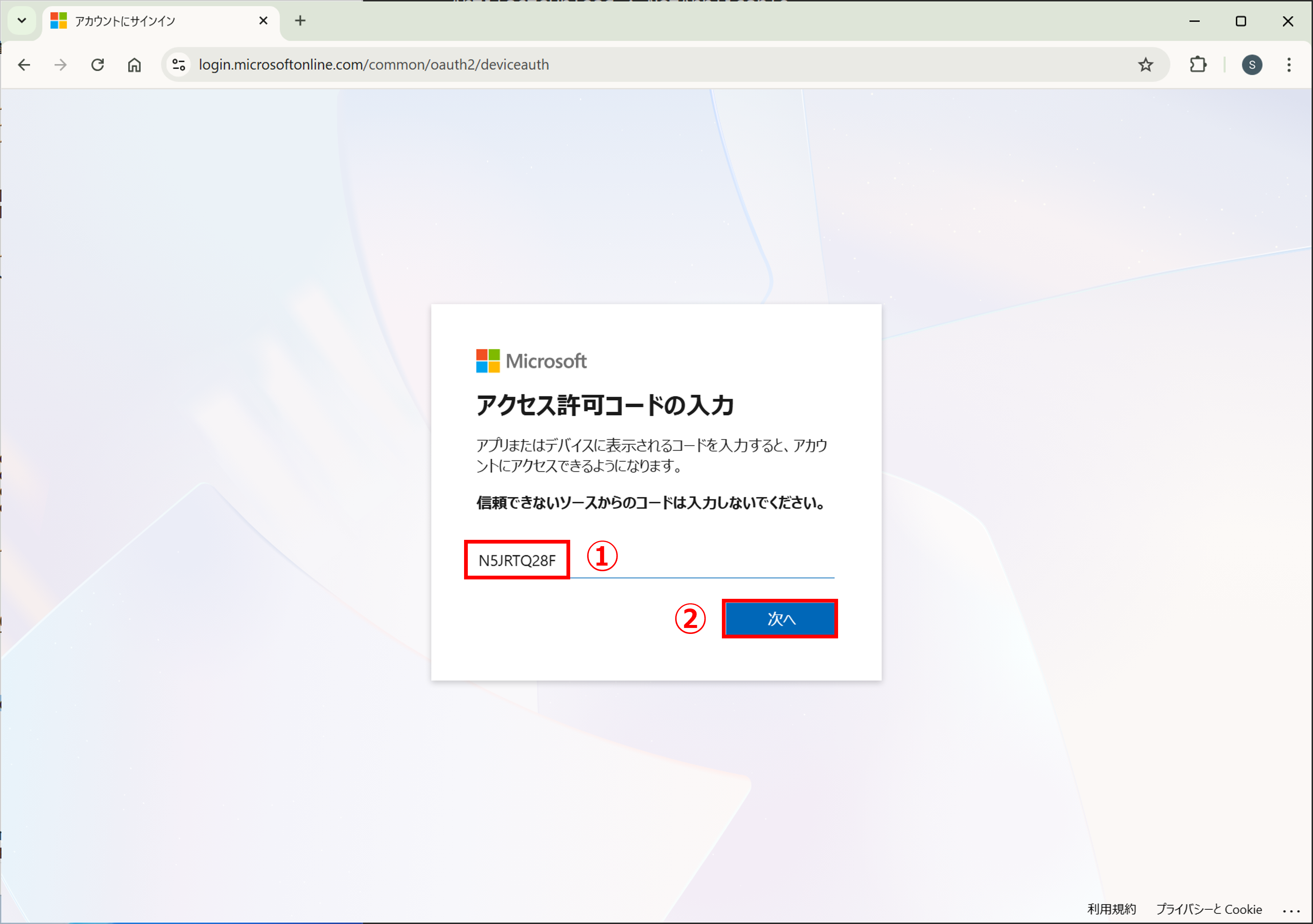 - [https://login.microsoft.com/device] にブラウザでアクセスします。
