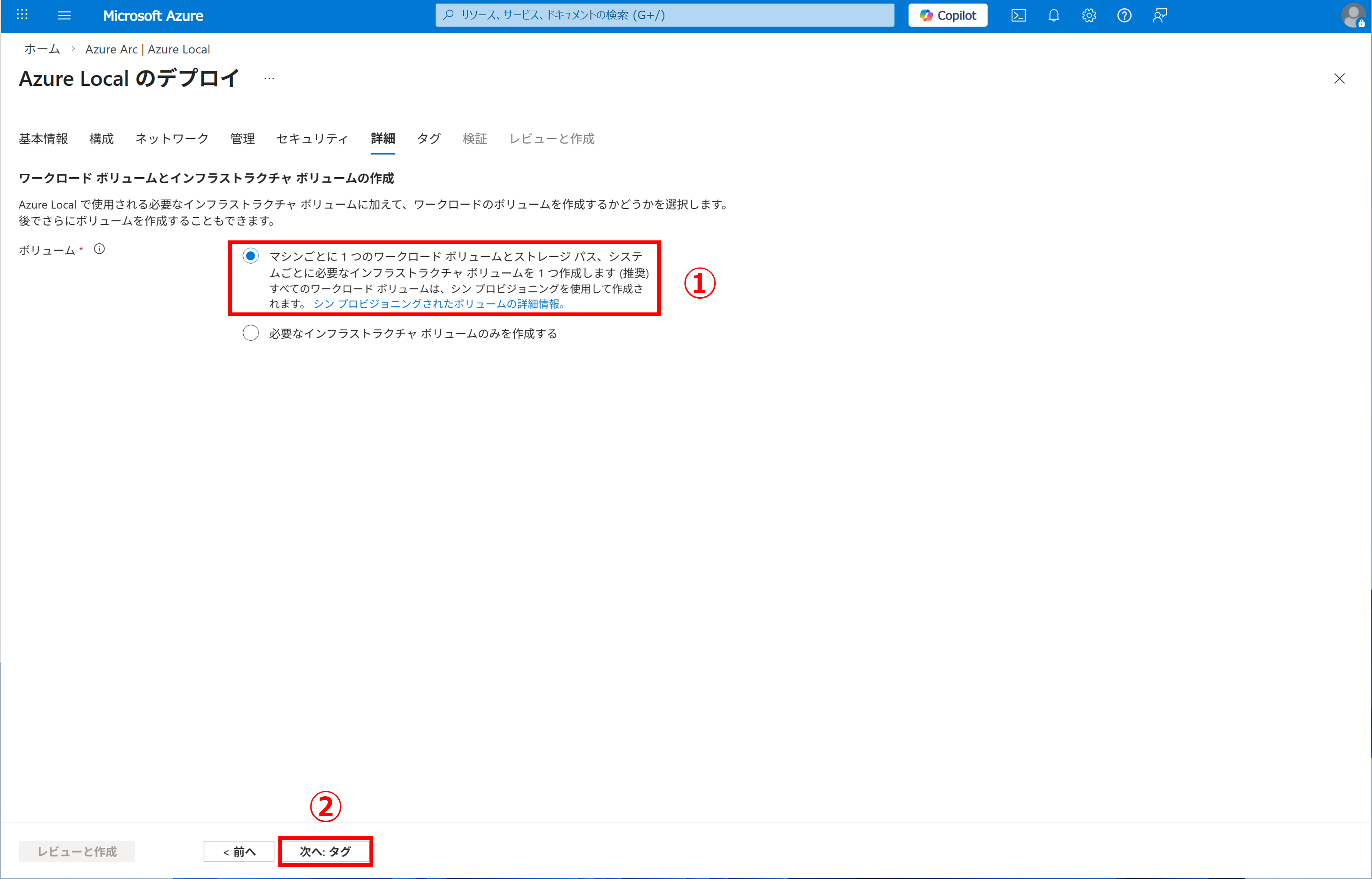 ※この推奨構成を選択すると、ワークロードボリューム(ユーザー仮想マシン用のボリューム)がノード数分作成されます。これによって、仮想マシンデータが各ボリュームに均等に分配されるため、容量効率の向上やIOPSの分散といったメリットを享受できます。 - [次へ:タグ] をクリックします。