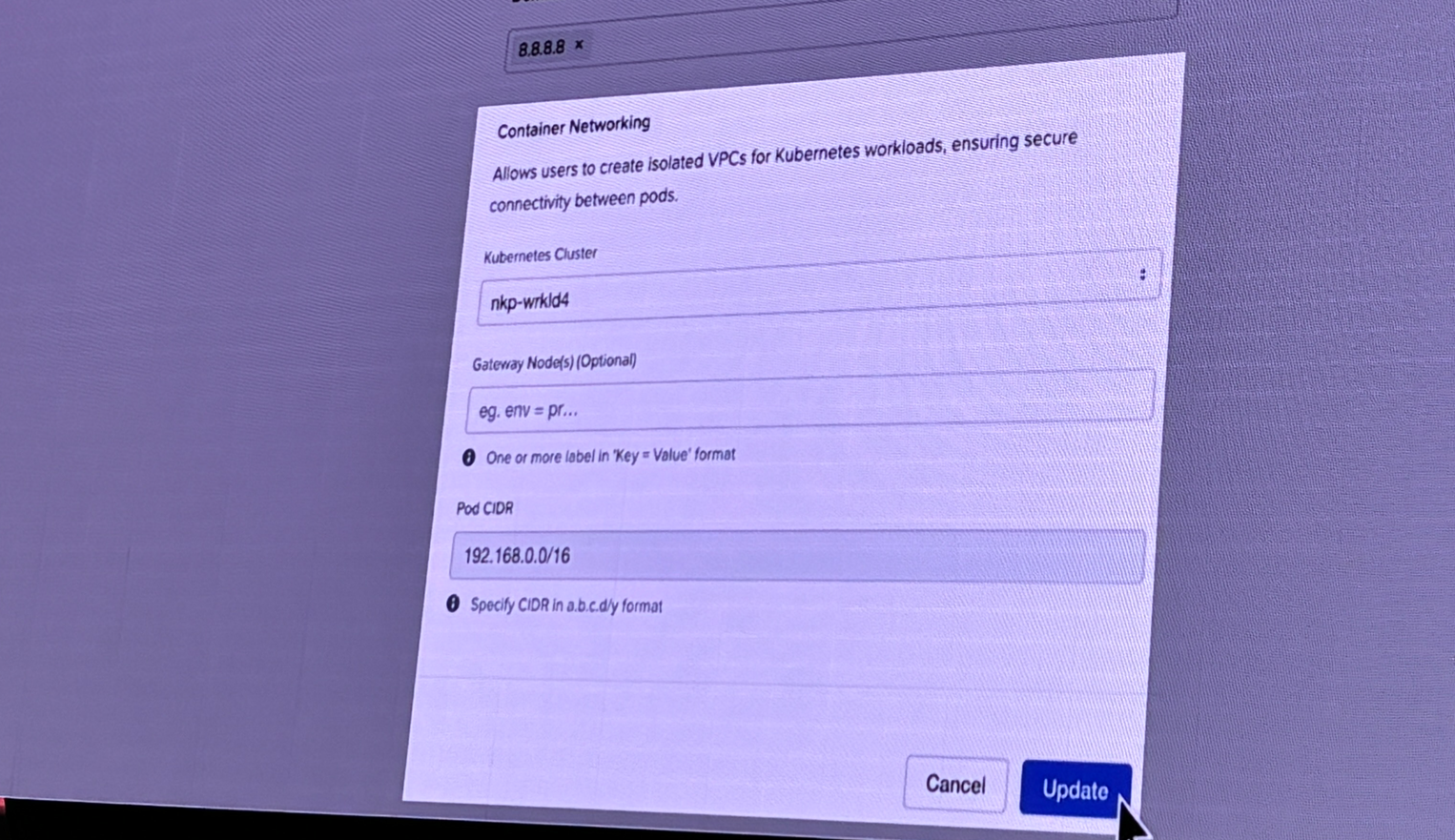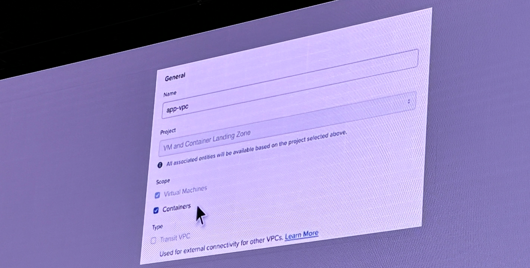 さらに、ここでの統一性として、Flow Virtual NetworkingのVPCを使用して、VMとコンテナを同じネットワーク空間に置けることや、Flow Network SecurityによってKubernetesのPodにも同じセキュリティポリシーを適用できることが紹介されました。つまり、ネットワークとセキュリティが、VMとKubernetesの境界で分断されない設計になっています。