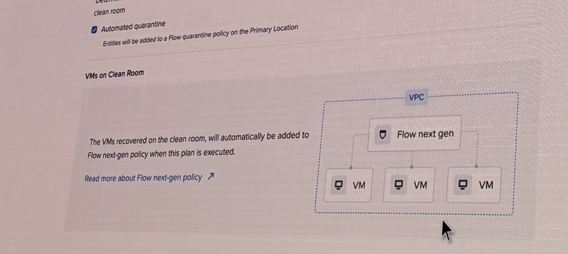 Cyber Recovery Planでは、Clean Roomで必要となるActive Directoryや、復旧中にスキャンを実行するためのフォレンジックツールのIPアドレスを指定する項目があり、また攻撃を検知したらプランを実行して自動隔離するといった設定ができるようです。また、Flowと組み合わせてVPCやセキュリティポリシーを自動適用し感染拡大を防止することも可能とのことでした。