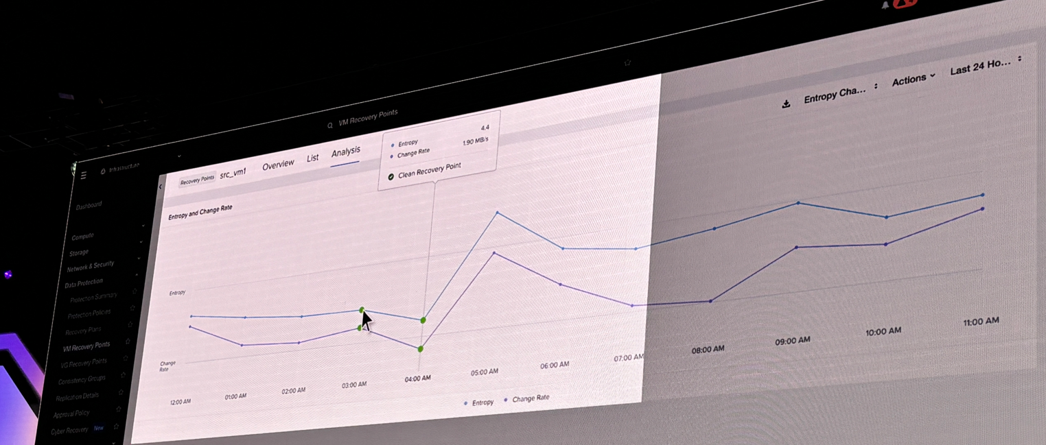 また、サイバー攻撃の検出方法も強化されており、独自のAOS Entropy Detection機能が搭載されたようです。これにより、仮想マシンディスクやリカバリポイントのエントロピー(ストレージの変更率を追跡し、一定のしきい値を超えているかどうか)を確認し「サイバー攻撃の可能性がある」ことを検知できるようになるとのことです。