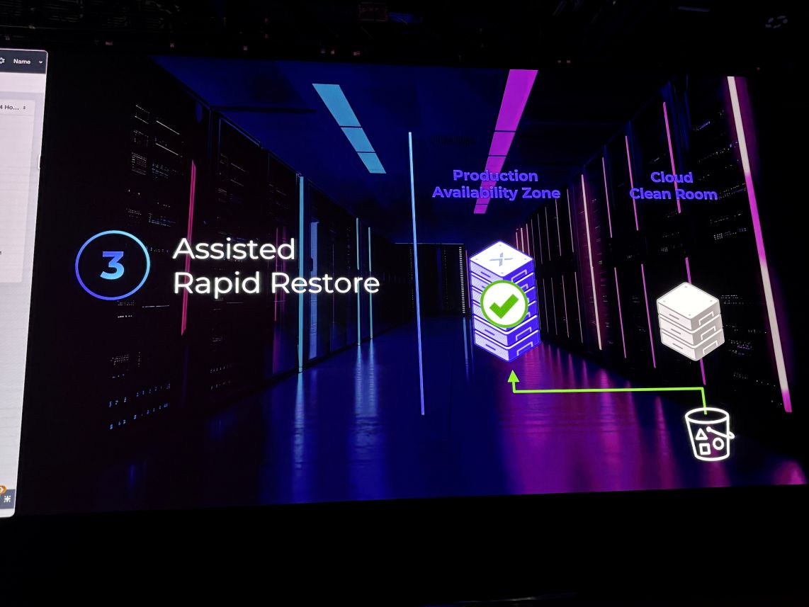 サイバー攻撃を受けた際に重要なことの一つは、復旧の複雑さにどう対処するかであり、業界のベストプラクティスとしては、隔離されたクリーン環境(Clean Room)を活用し、コピーしたデータを本番環境へ戻す前にテストすることが挙げられる、といった説明が前置きとして語られました。