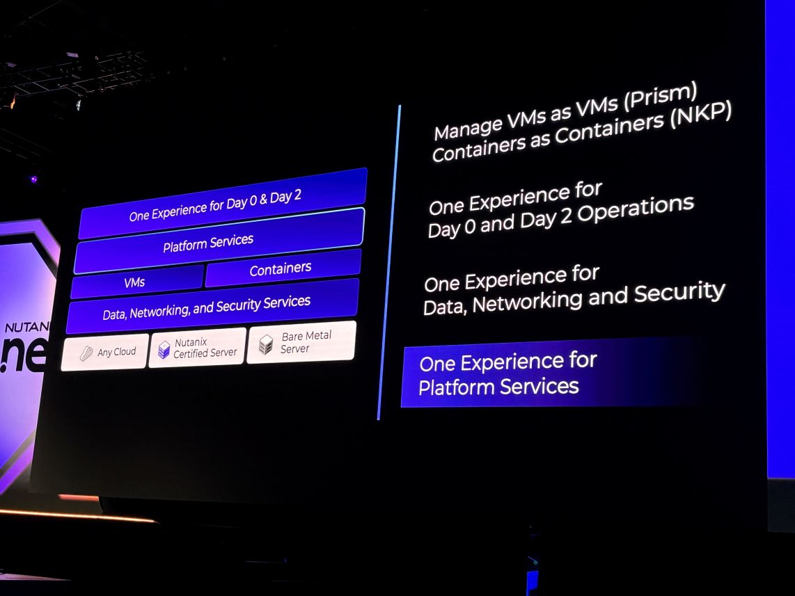 VMはPrism Central、コンテナはNKPで扱いながらも、価値を生み出すのは運用レイヤーにおけるDay 0 / Day 2のオペレーション統合であると主張していました。ユーザー管理、権限管理、デプロイ、構築、運用、ガバナンス、データ保護、ネットワークといった要素をできるだけ統一感のある流れで扱えるようにする方針のようです。