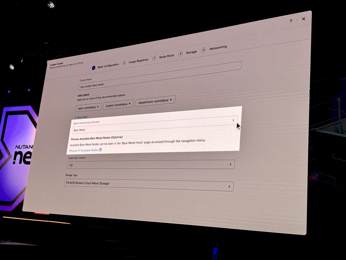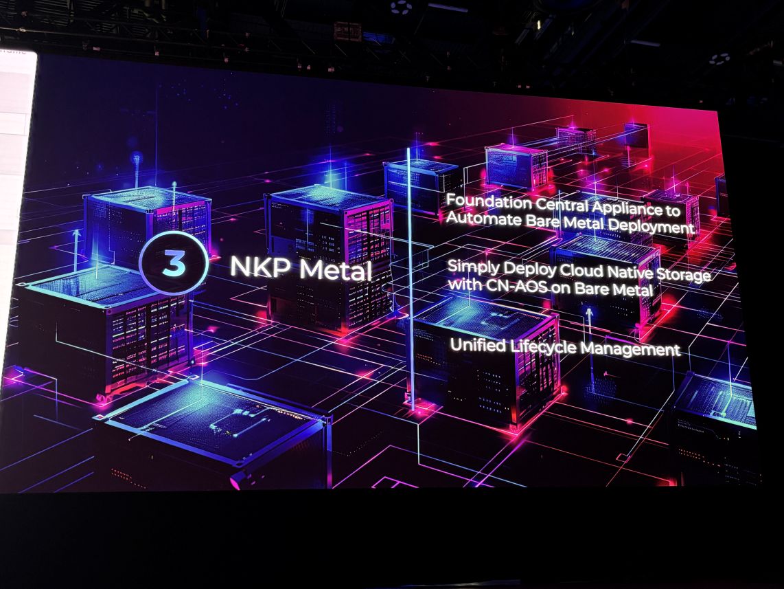 Modernize Nowの後半で大きく取り上げられたのがNKP Metalです。Nutanixはこれまでもオンプレミス、パブリッククラウド、VM上のコンテナなど複数の実行形態を提供してきましたが、今回はそこにベアメタルが加わりました。ポイントは、「ベアメタルでKubernetesを動かす」ということではなく、ベアメタルのコンピュート/ストレージと従来のVMベース基盤を、一貫したライフサイクル管理で扱えるようにした点です。