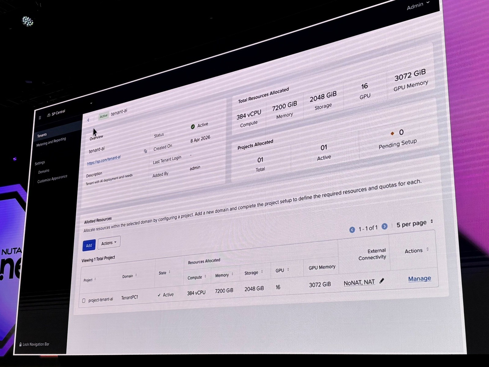 あわせて印象的だったのが、今回の.NEXT 2026で発表されたSP CentralをAIユースケースへ拡張して見せていた点です。SP Centralは、Nutanixインフラストラクチャ上でマルチテナントを実現します。