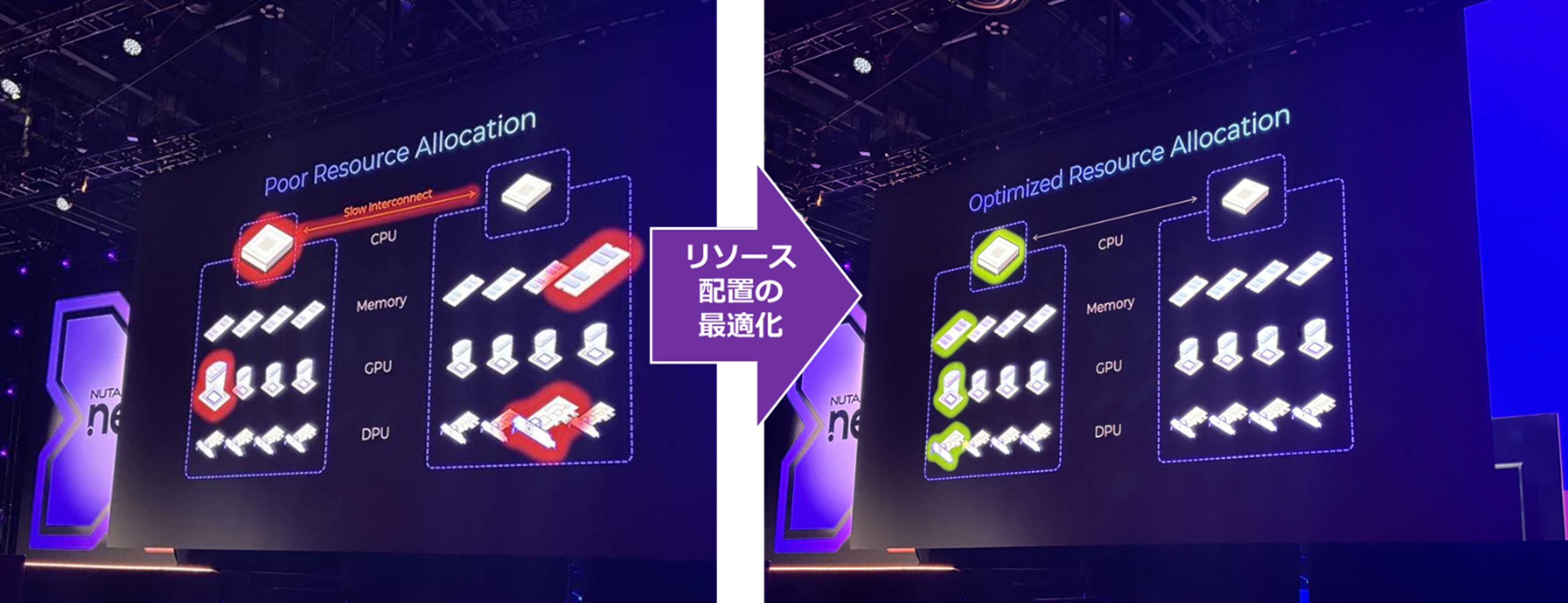 本パートでまず発表されたのは、CPU、NUMAノード、GPU、DPU(NIC)の物理配置を意識したリソース配置の最適化です。こうした物理トポロジーを踏まえた最適化は、仮想化プラットフォームベンダーとしてNutanixが従来から得意としてきた領域であり、AI基盤でもその強みを活かそうとしている点が印象的でした。