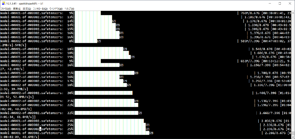 model-0000X-of-0000X.safetensorsはモデル本体の重みを保持していて、出力例では2つに分割されている状態です。一方、config.jsonはモデルの構造を定義する様々な情報が書き込まれています。例えば、