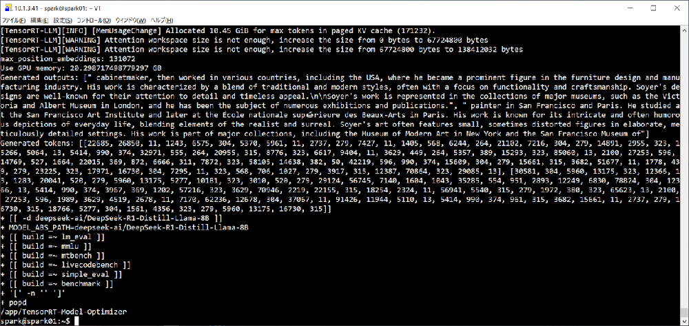 前項でTensorRT Model Optimizerコンテナを実行したことで、Hugging Faceからモデルがダウンロードされ、モデルの出力までが実行されます。