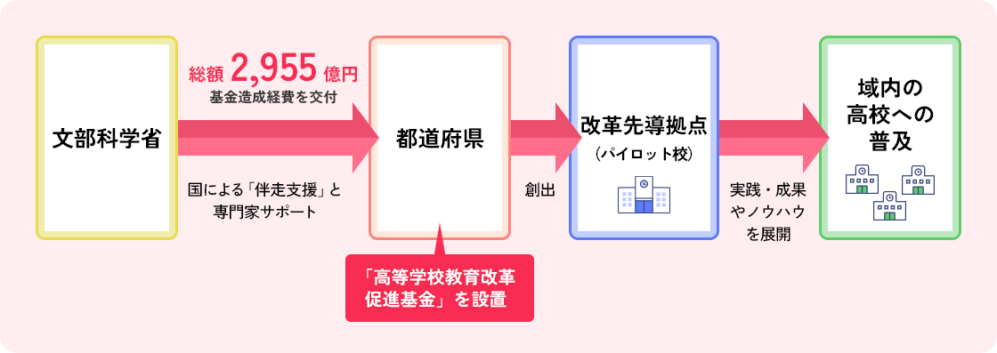 N-E.X.T.ハイスクール構想は、各都道府県に設置される「高等学校教育改革促進基金」を財源とし、