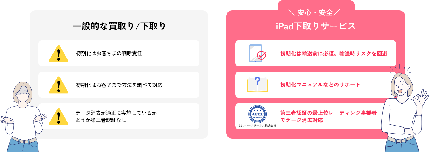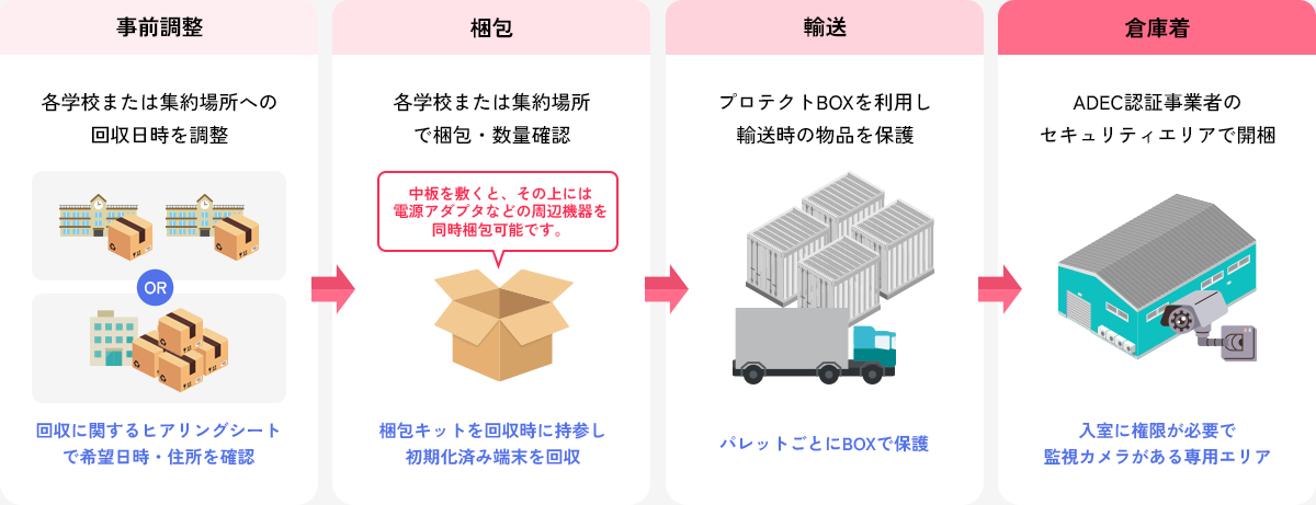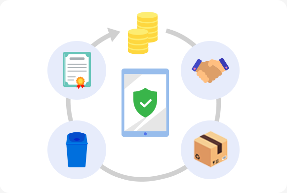 処理のサポート、 梱包回収、データ消去と証明書発行、買取りまでをワンストップで安全に対応できるサービスです。