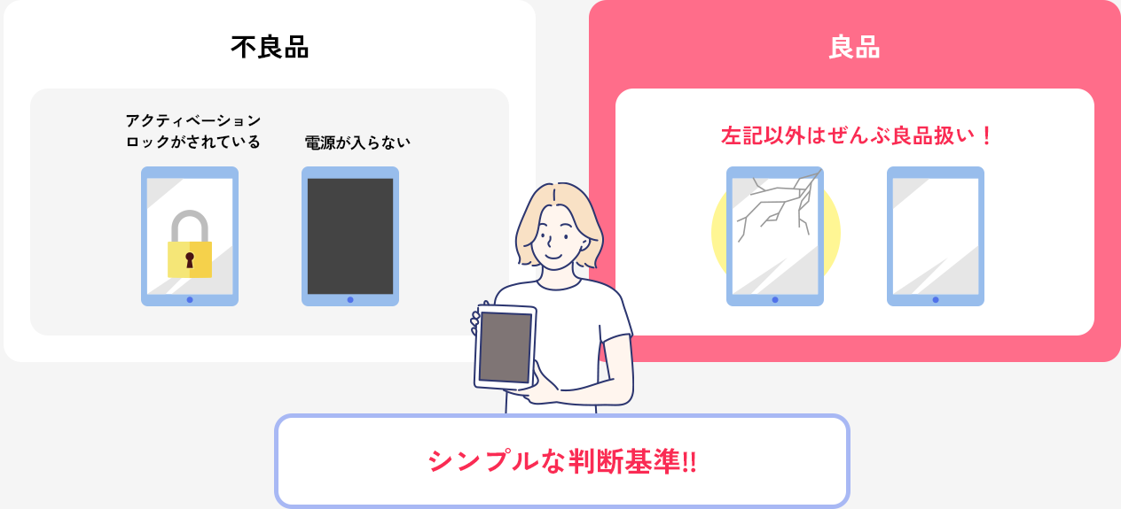 アクティベーションロックと電源がはいらない端末以外は良品として承ります。