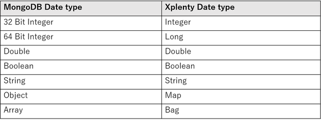 ソースコンポーネントとデスティネーションコンポーネントは、主要なMongoDBデータタイプをサポートしています。次の表は、これらのデータタイプとXplentyのネイティブデータタイプの対応を示しています。