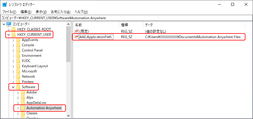 レジストリの「HKEY_CURRENT_USER\Software\Automation Anywhere\AAE.ApplicationPath」設定値が