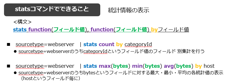 statsコマンドは主に統計情報の集計値を検索するために利用するコマンドで、とてもよく使うコマンドです。