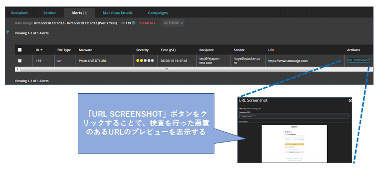 こちらは検査を行ったURLにアクセスしなくても、そのサイトのスクリーンショットを確認できる機能になります。実際にどういったフィッシングサイトのURLが送られてきているのかを簡単に確認することができる機能となります。